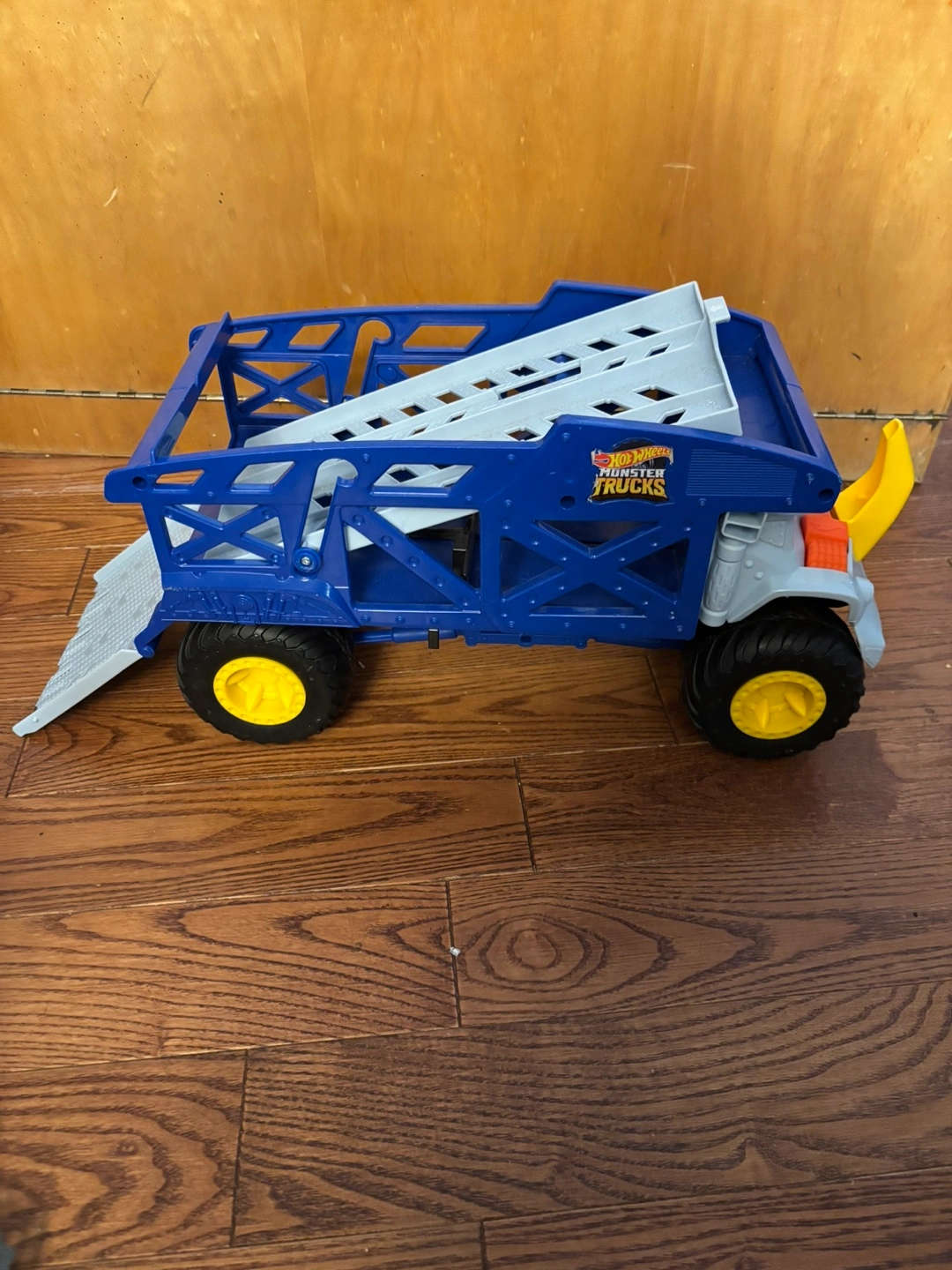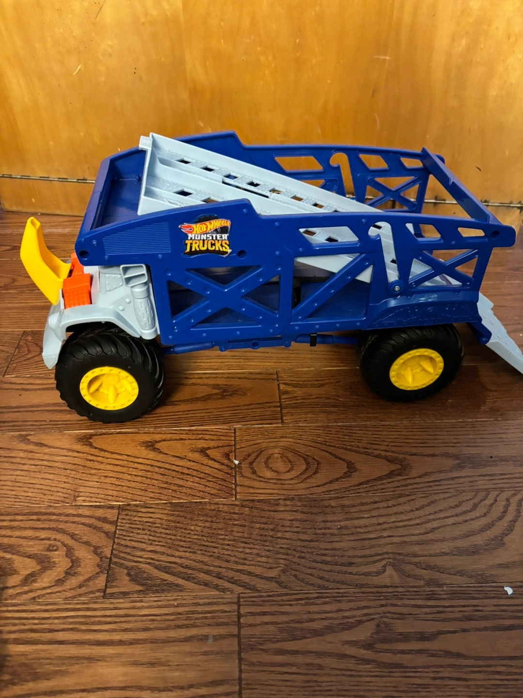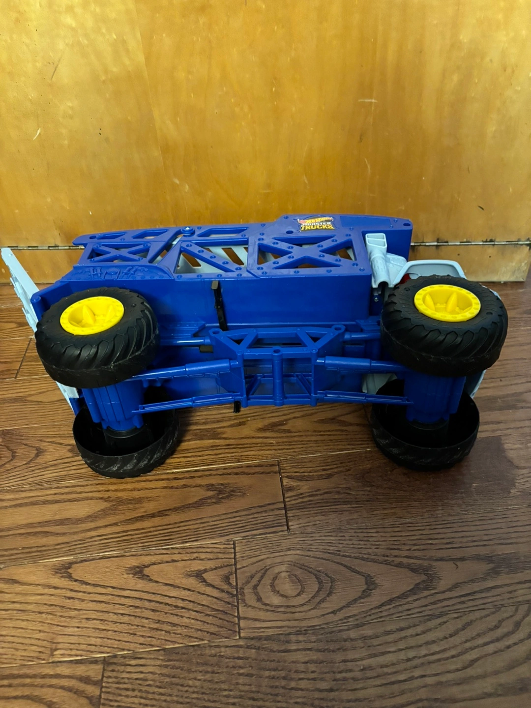 Hot Wheels Monster Trucks Transporter in good condition! This toy is ready for new adventures. It features a blue and grey design with the Hot Wheels Monster Trucks logo. Perfect for any young monster truck enthusiast!