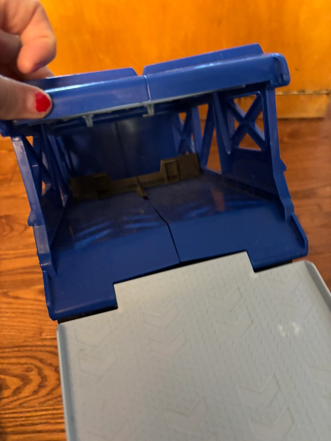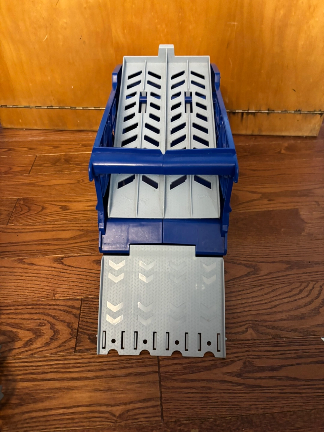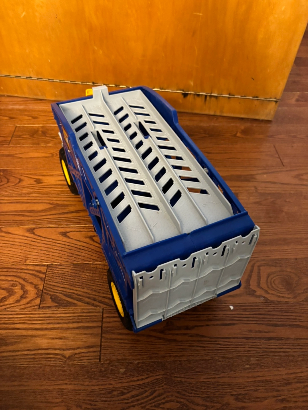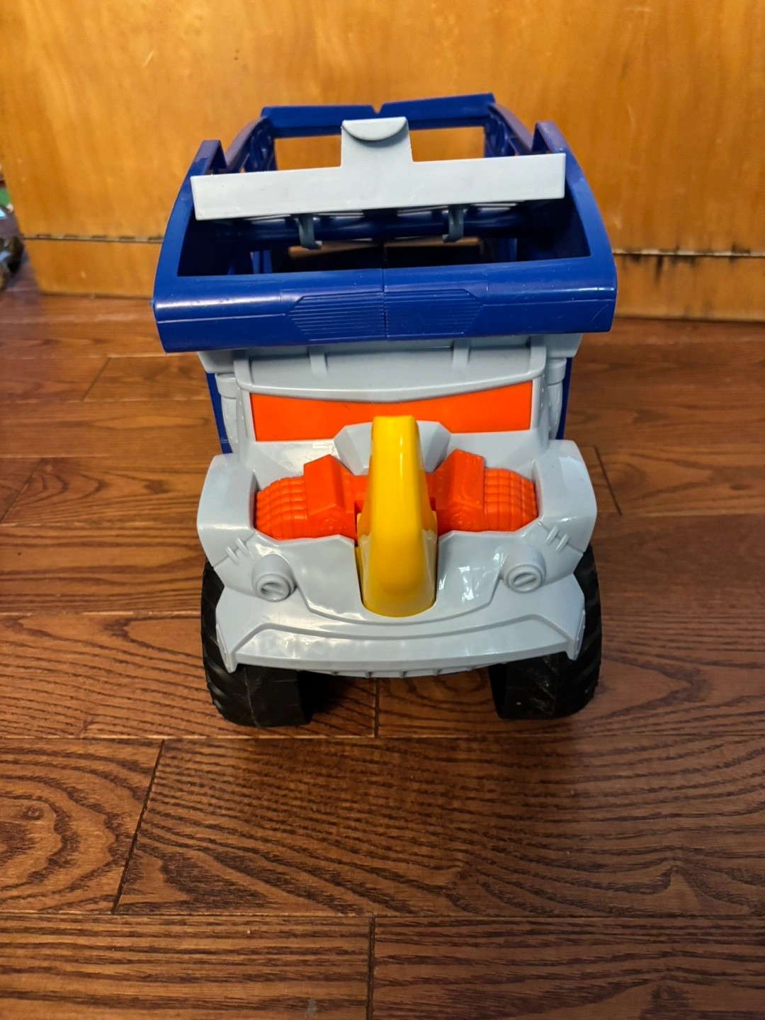 Hot Wheels Monster Trucks Transporter in good condition! This toy is ready for new adventures. It features a blue and grey design with the Hot Wheels Monster Trucks logo. Perfect for any young monster truck enthusiast!