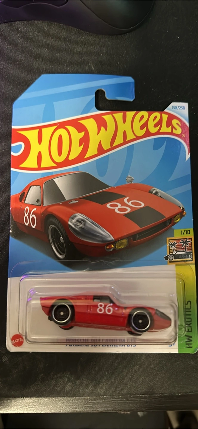 5Hot Wheels 1/10 scale diecast car. Red Porsche 904 Carrera GTS. Number 86 on the side. Part of the HW Exotics series. Collectible.
