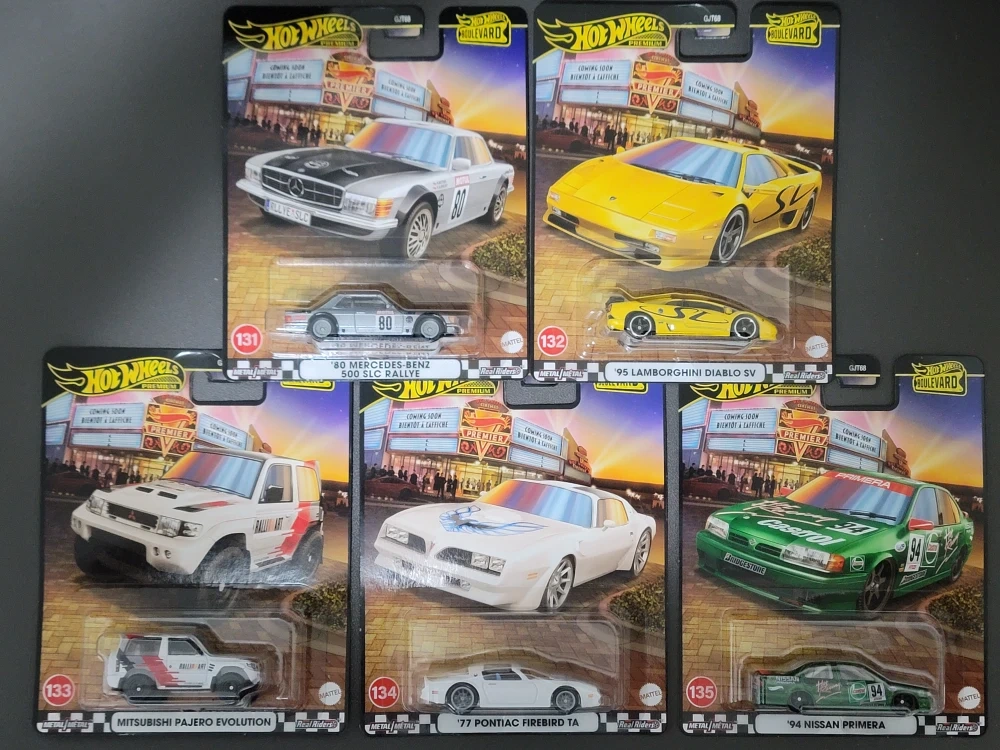 39Selling a collection of Hot Wheels Boulevard diecast cars! Each car is brand new in its original packaging: - '80 Mercedes-Benz 500 SLC Rallye - '95 Lamborghini Diablo SV - Mitsubishi Pajero Evolution - '77 Pontiac Firebird TA - '94 Nissan Primera Perfect for collectors or anyone who loves cool cars
