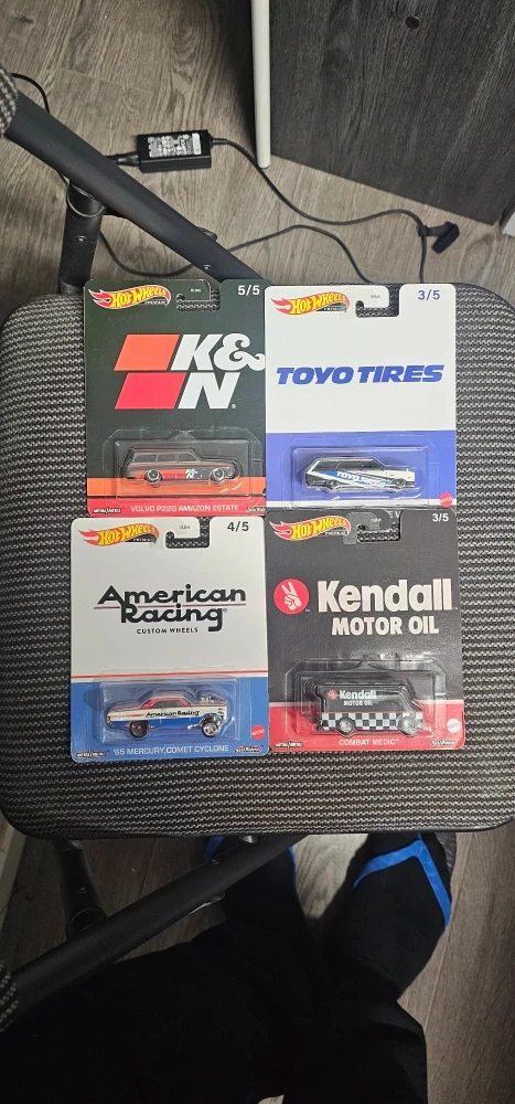 79Selling a collection of Hot Wheels Premium diecast cars, still in their original packaging! You'll find cool designs like: - K&N Volvo P220 Amazon Estate - Toyo Tires model - American Racing '65 Mercury Comet Cyclone - Kendall Motor Oil Combat Medic
