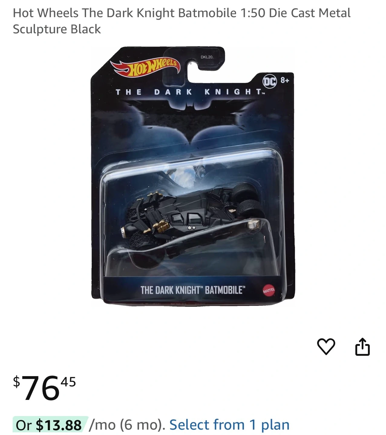 Selling a Hot Wheels The Dark Knight Batmobile 1:50 Die Cast Metal Sculpture in black. It's in used condition. The original price was $76.45