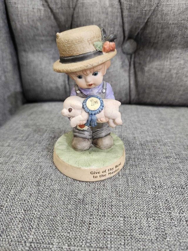 This charming Debbie Bell Jarratt figurine features a young boy holding a piglet with a "1st" ribbon, standing on a base that reads "Give of Thy Best to the Master." It's a delightful piece for collectors. This is a used item, but it is in good condition. This will look great in any collection! Cash accepted.