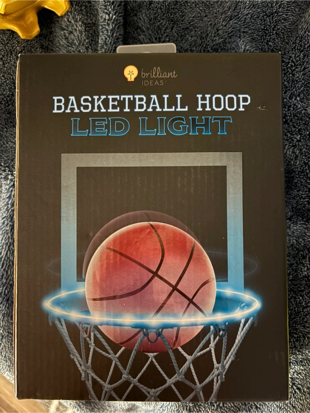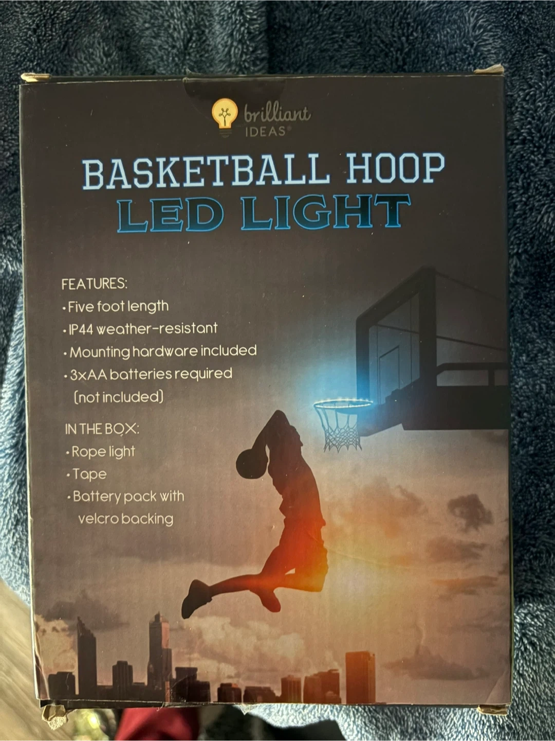 This is a Brilliant Ideas Basketball Hoop LED Light. It's five feet in length and IP44 weather-resistant. Mounting hardware is included, but 3xAA batteries are not. The box contains the rope light, tape, and a battery pack with velcro backing.