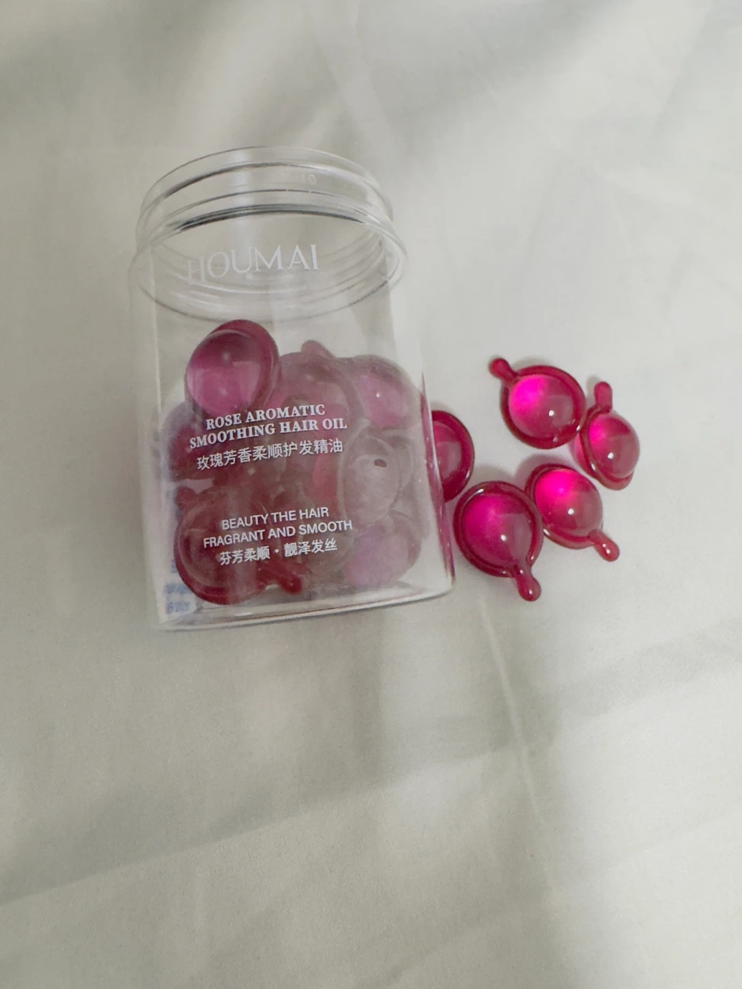 These Houmai Rose Aromatic Smoothing Hair Oil capsules are designed to beauty the hair, leaving it fragrant and smooth. They come in a clear container, and there are a few extra capsules outside the container as well. Give your hair a little extra love with these!
