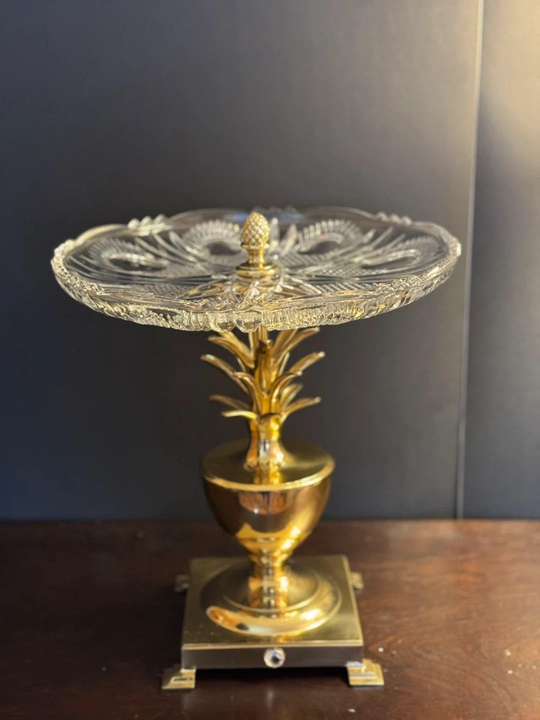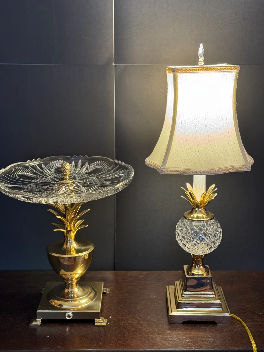 Selling a charming vintage set featuring a pineapple crystal lamp and a matching cake crystal stand. Both pieces have a beautiful brass gold-tone base.Adding a touch of elegance to any room. They're in great condition and ready to brighten up your home!Lamp high 23 inches, cake stand high 14 inches, diameter 12 inches