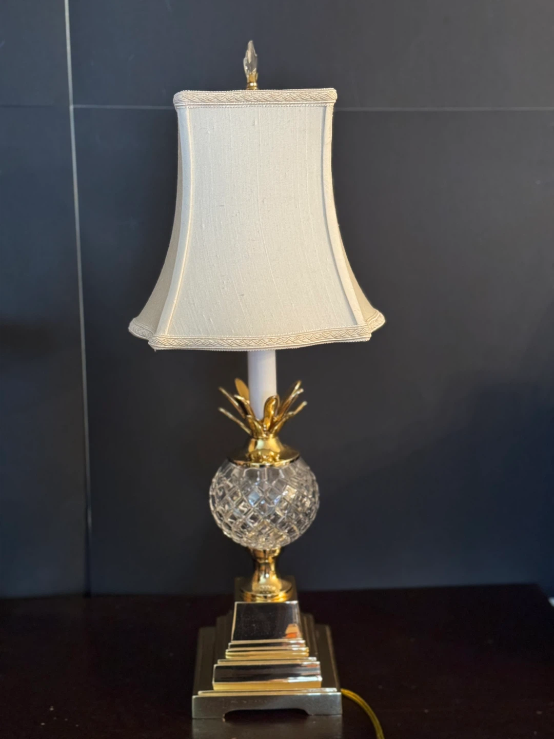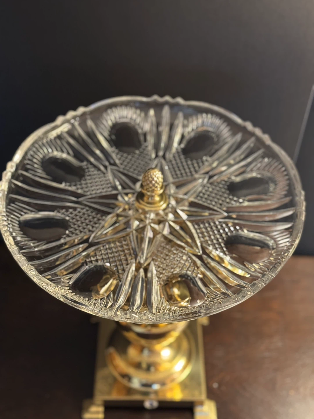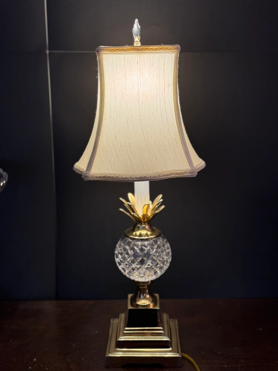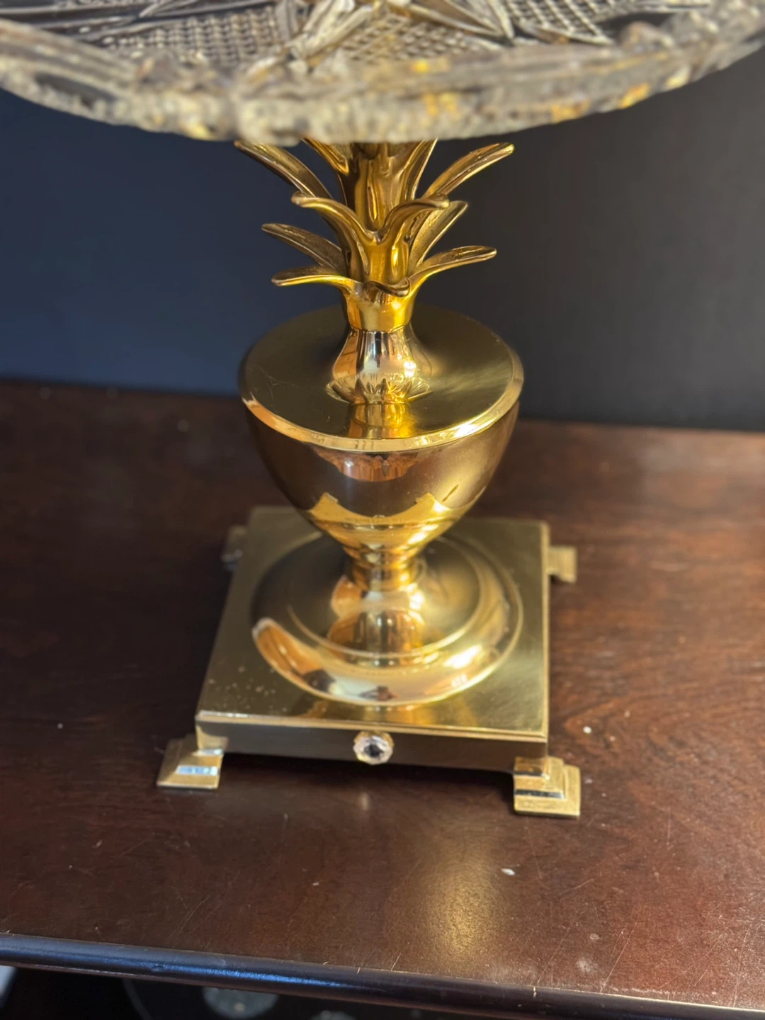 Selling a charming vintage set featuring a pineapple crystal lamp and a matching cake crystal stand. Both pieces have a beautiful brass gold-tone base.Adding a touch of elegance to any room. They're in great condition and ready to brighten up your home!Lamp high 23 inches, cake stand high 14 inches, diameter 12 inches