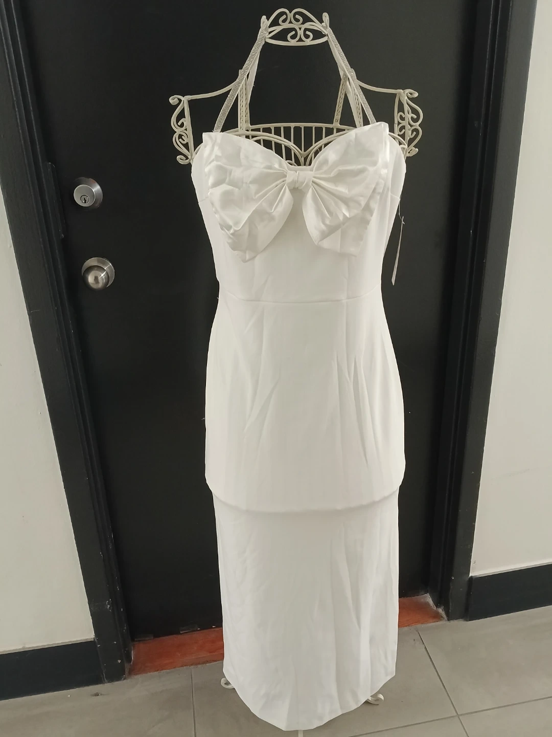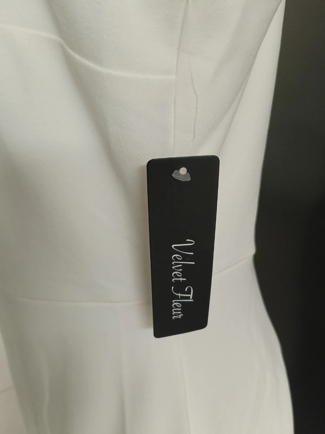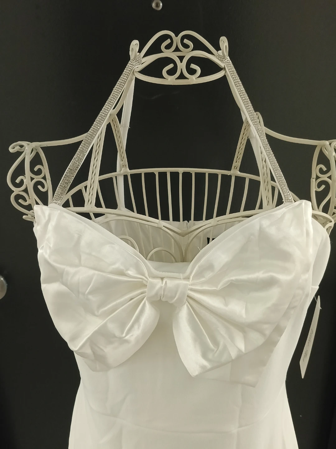White Velvet Fleur dress with a large bow accent on the bust. Straps are embellished with rhinestones. Made in Vietnam.
