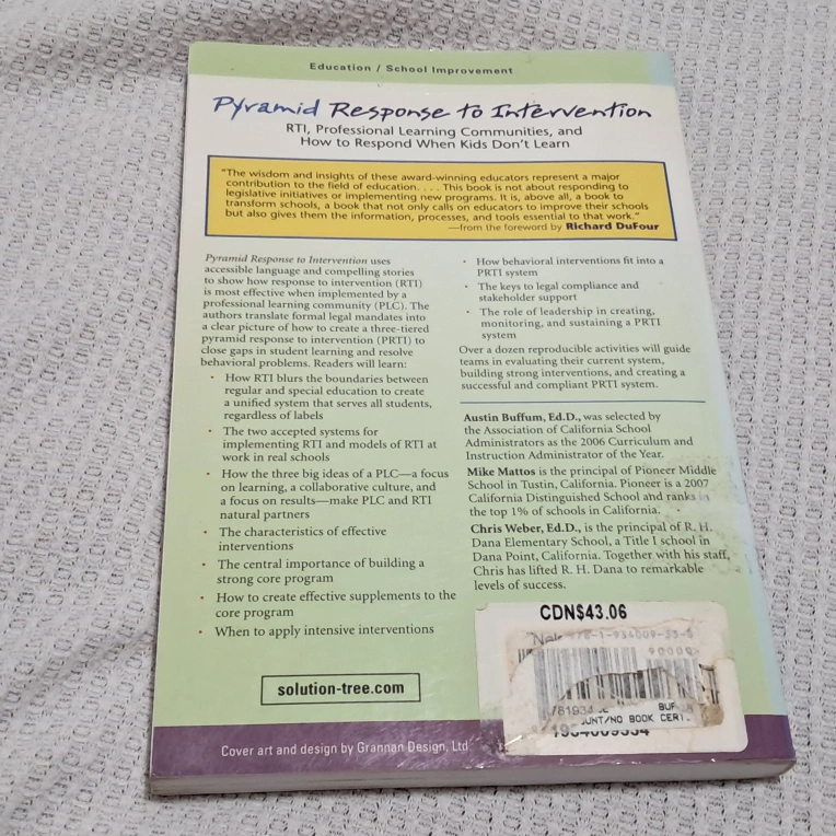 104Selling the book 'Pyramid Response to Intervention' by Austin Buffum, Mike Mattos, and Chris Weber. This book discusses RTI, professional learning communities, and how to respond when kids don't learn. A great resource for educators and anyone interested in improving educational practices