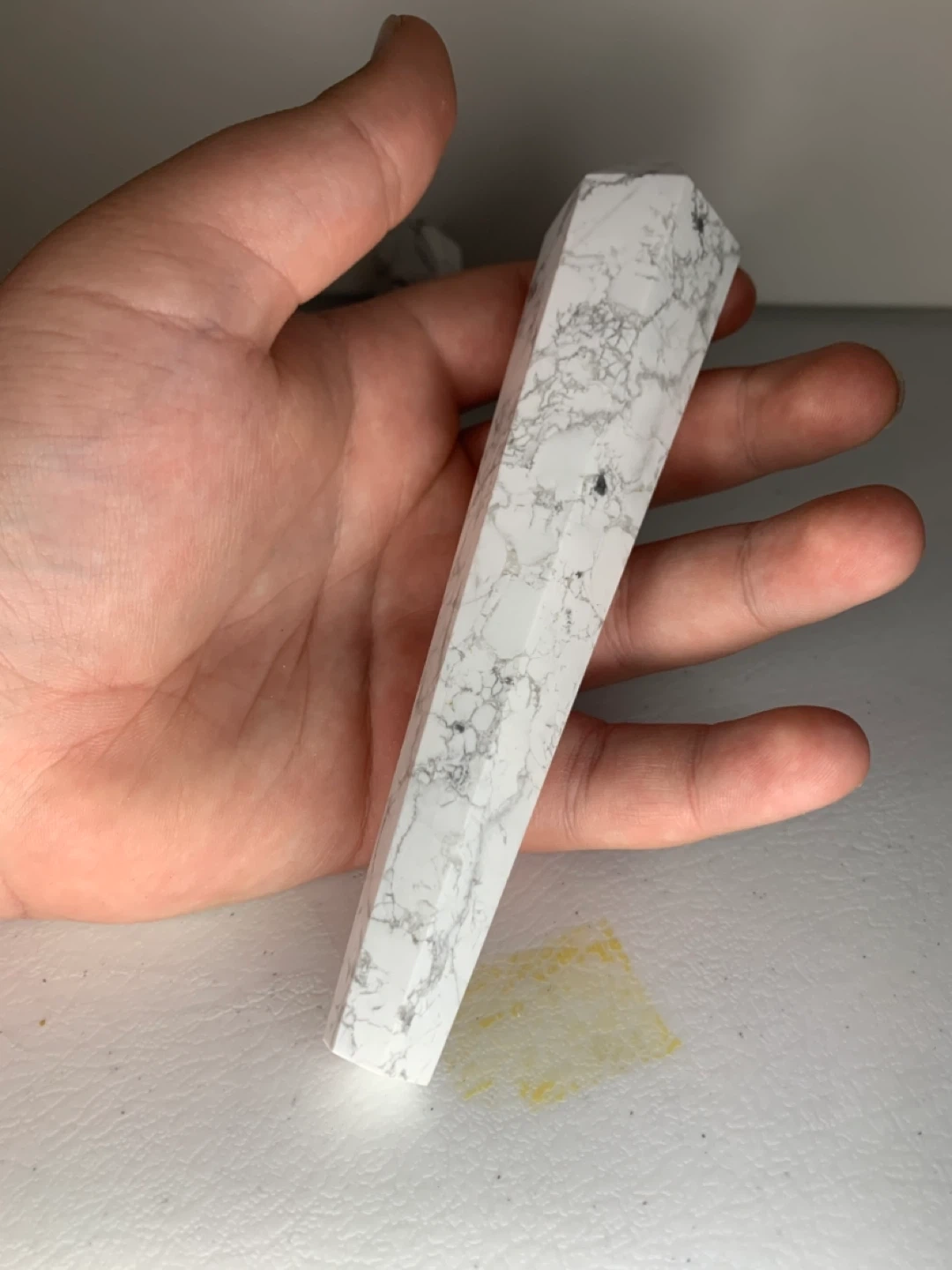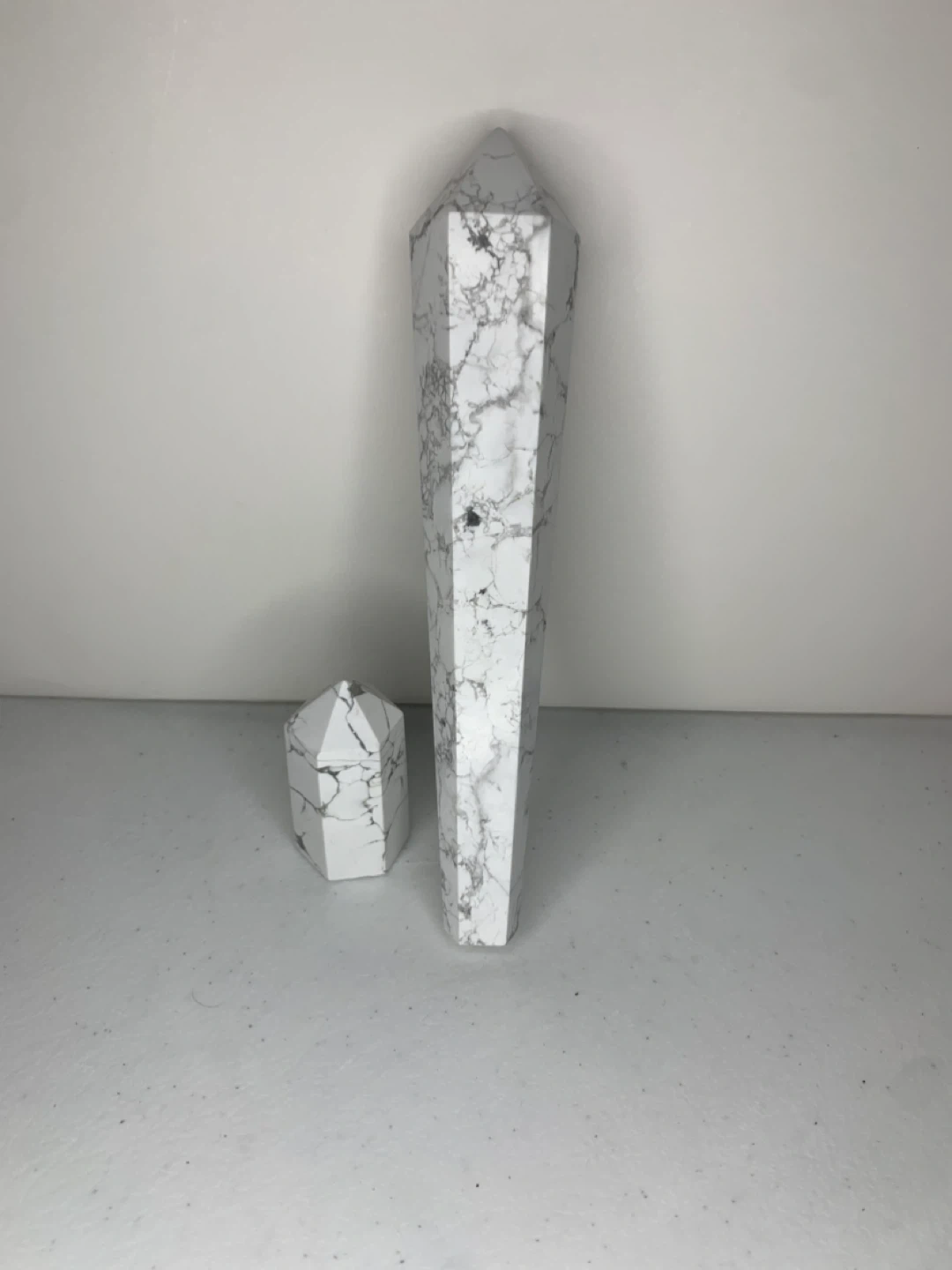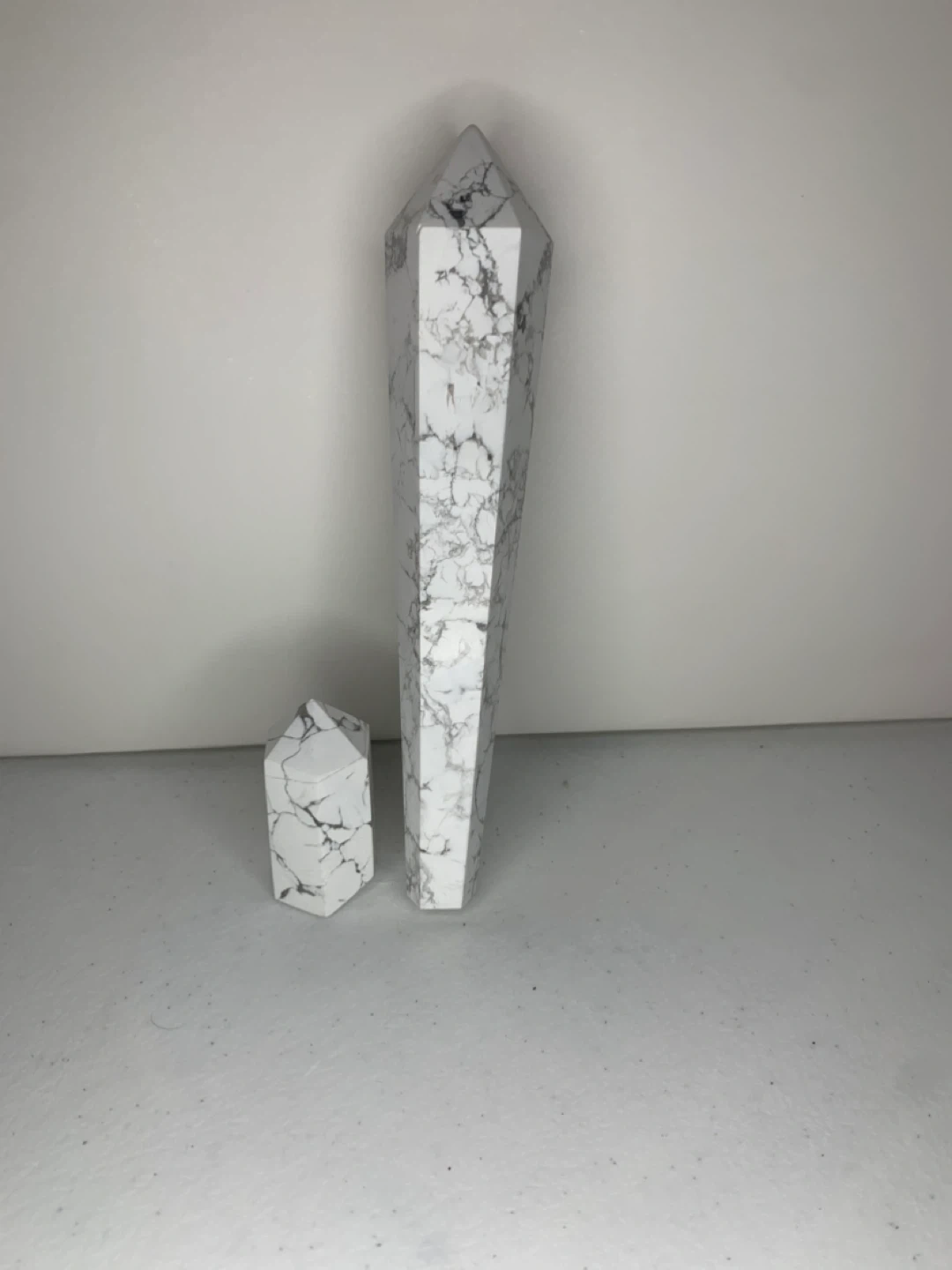 Selling a beautiful howlite crystal point tower set! These pieces have lovely marbling and are perfect for adding a touch of zen to any space. They're in great condition and would make a wonderful addition to your crystal collection or a thoughtful gift for someone special
