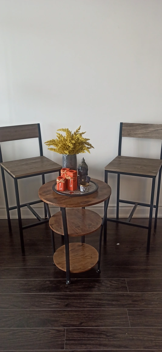 I'm selling a round end table with three tiers with 2chairs(decor not included)It features a sturdy metal frame and a warm, rustic wood finish. Perfect for adding coffee corner and style to any room in your home. used as staging at corner of the house, hardly used few times.
