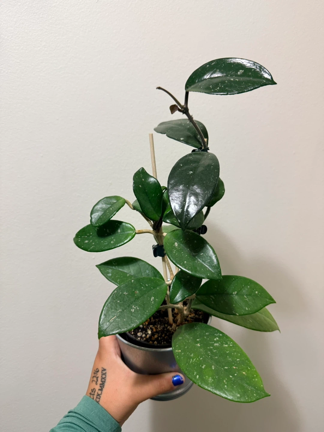 82Selling a healthy hoya plant! It comes in a cute silver pot and is ready to brighten up your space. The leaves are a lovely dark green with some beautiful speckling. It's currently supported by a small wooden stake. A great addition to any plant lover's collection!