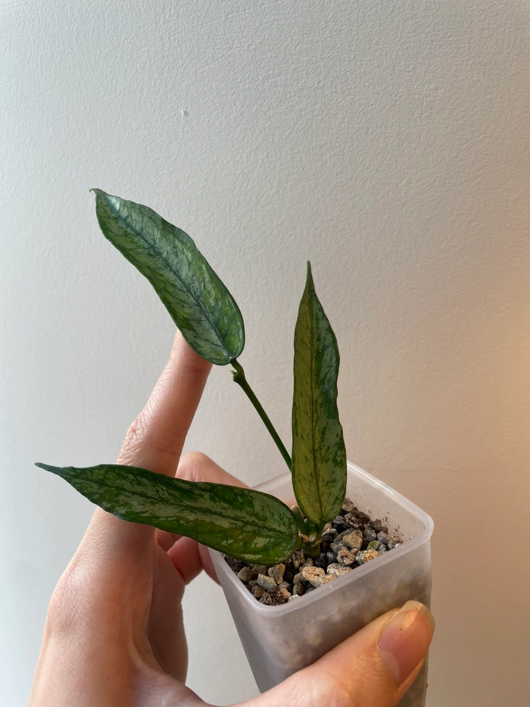 292Selling a lovely hoya pandurata with splashy variegation! It's currently potted in a clear plastic container with soil and pon mixture. The leaves have a beautiful green and silver pattern.
