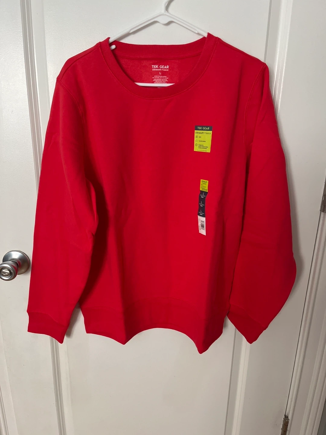 (RED) Selling a red Tek Gear Ultrasoft Fleece long-sleeve sweatshirt in size large! It's soft and comfortable, made with more-responsible materials. The ultrasoft fleece provides warmth and supports a comfortable fit