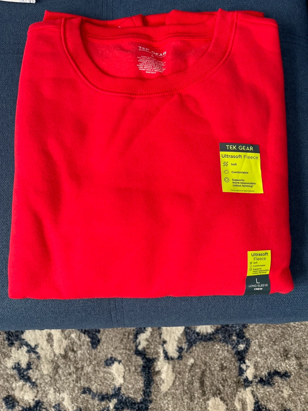 (RED) Selling a red Tek Gear Ultrasoft Fleece long-sleeve sweatshirt in size large! It's soft and comfortable, made with more-responsible materials. The ultrasoft fleece provides warmth and supports a comfortable fit