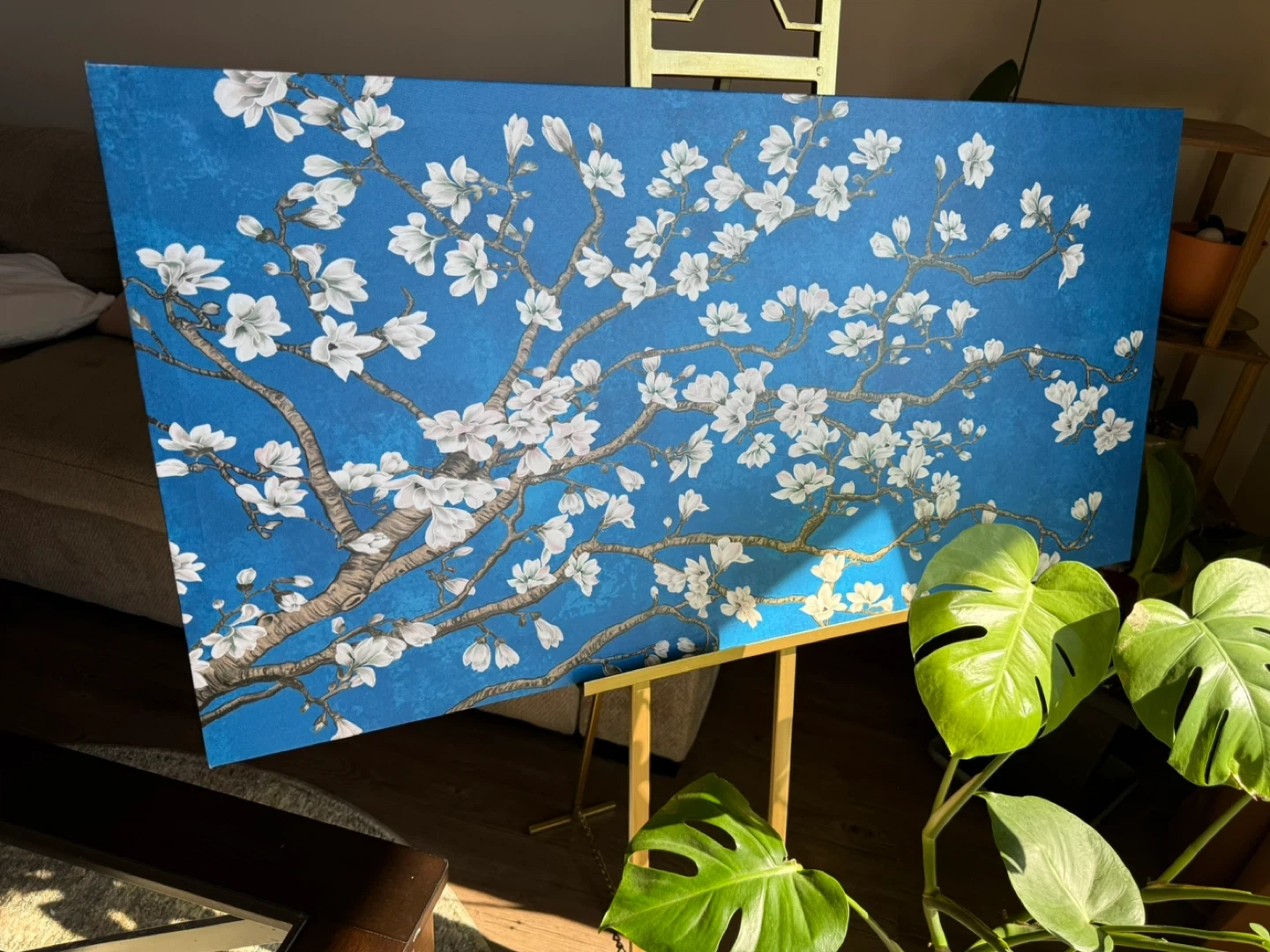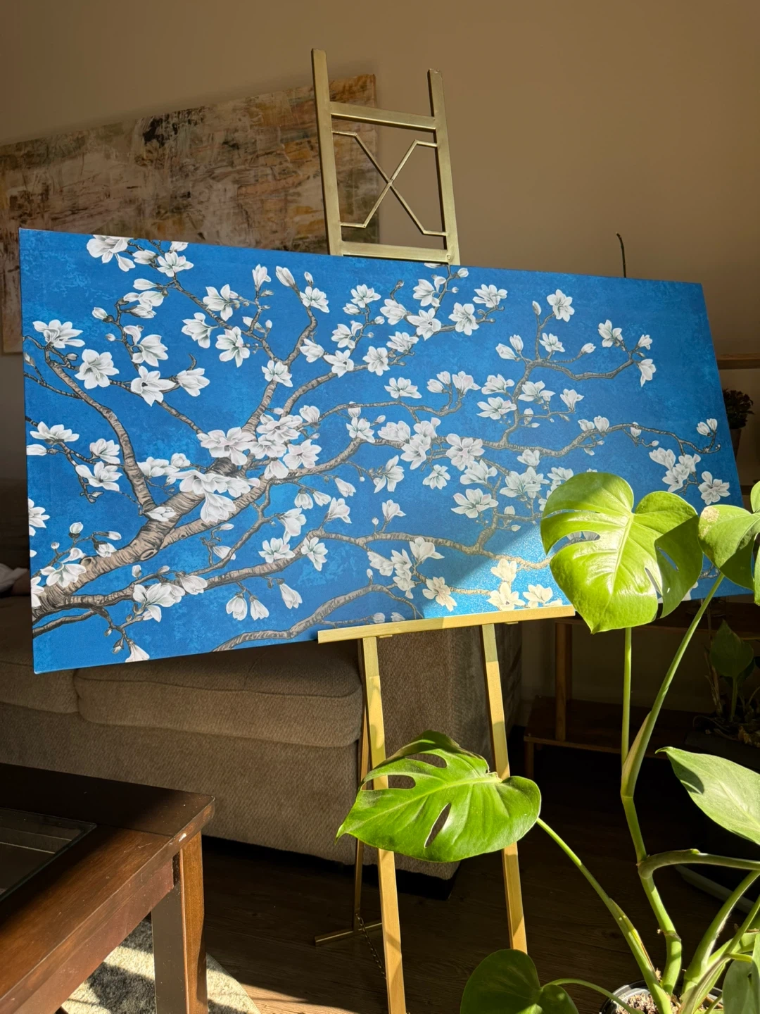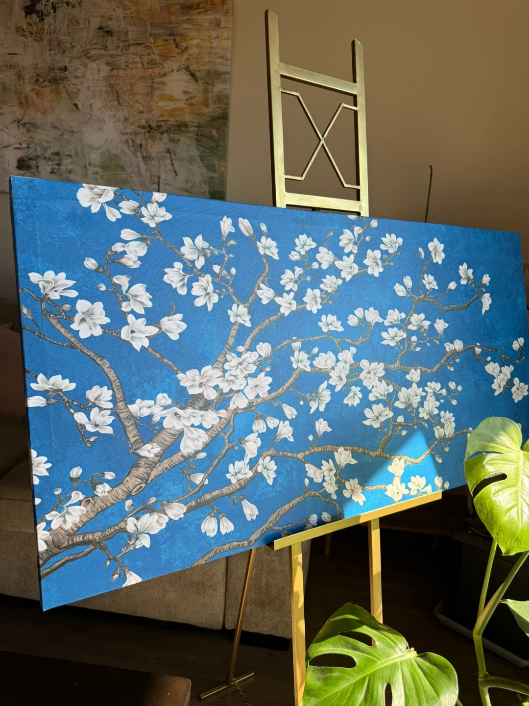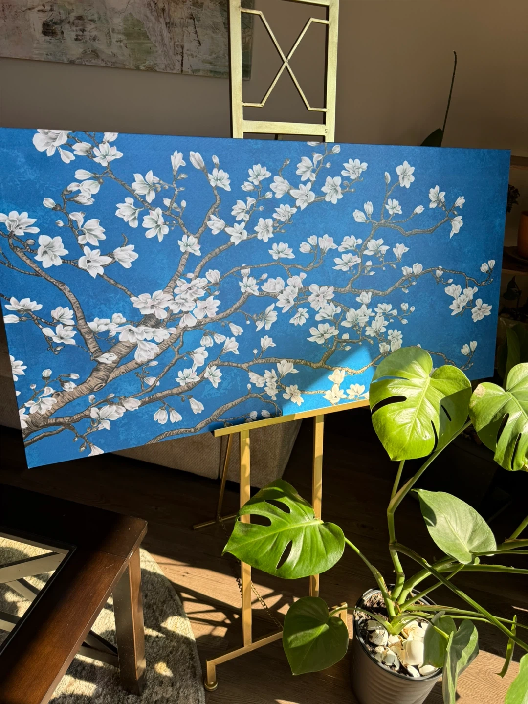 A beautiful floral tree painting on a vibrant blue canvas! This piece would be a lovely addition to any room, adding a touch of nature and elegance to your space. The canvas is in great condition and ready to be displayed