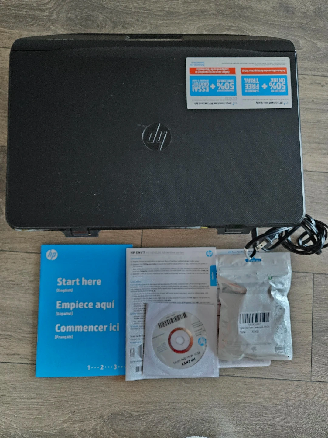 75Selling an HP Envy 4520 all-in-one printer! It can print, scan, copy, and connect to web services. It comes with the power cord, software CD, and some ink cartridges to get you started