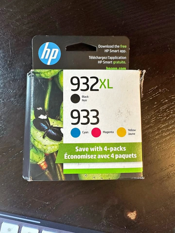Hewlett Packard Ink: 1. NEW unopened combo package of 932XL Black and 933 each of cyan, magenta & yellow 2. New unopened 1 pkg 933 XL cyan 3. 3 opened packages of (2) yellow and (1) cyan. No longer have the printer requiring this ink.