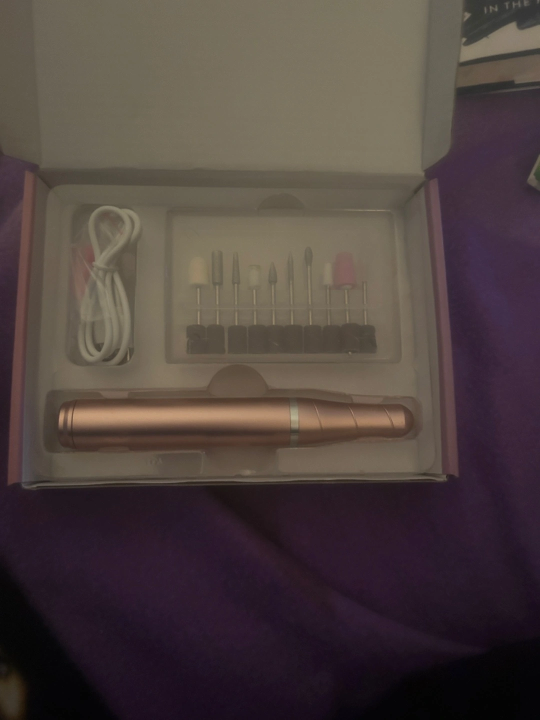 Rose gold electric nail drill. Includes multiple drill bits and USB charging cable. Comes in original packaging. User manual included. Package opened but product not used.