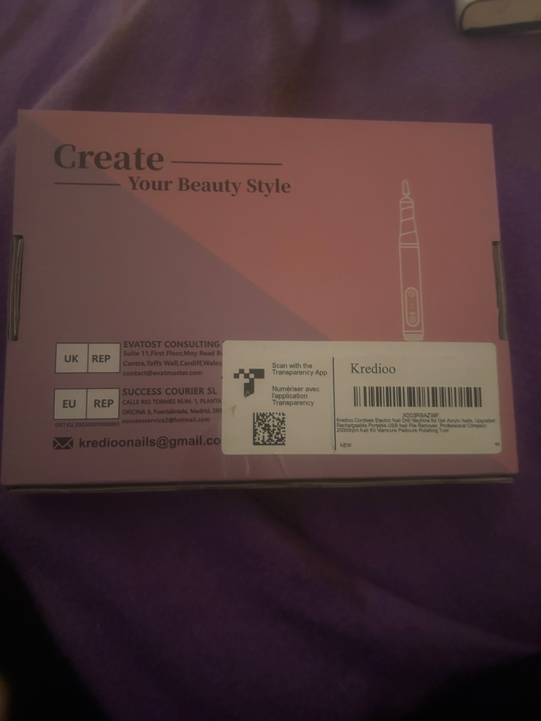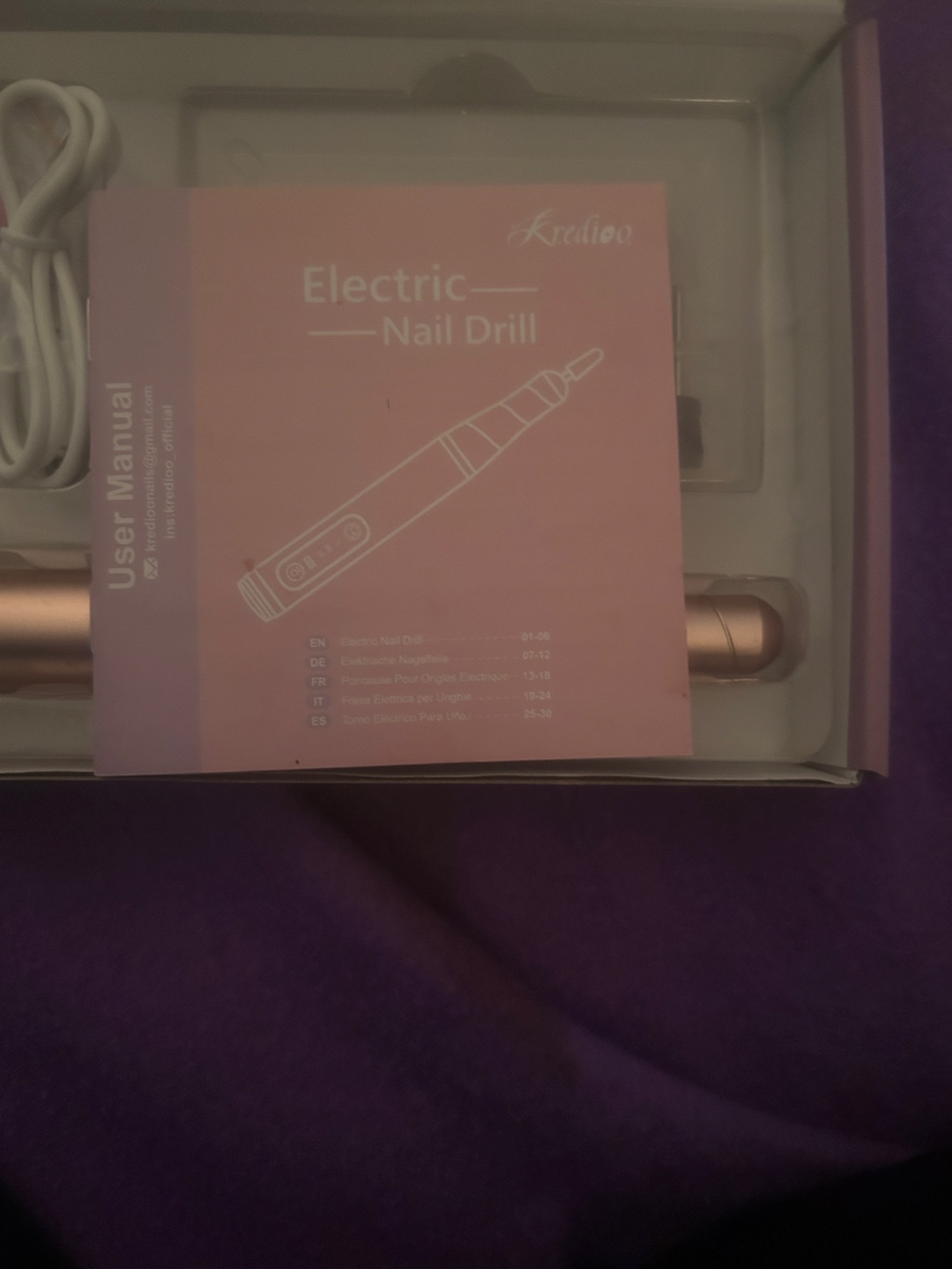 Rose gold electric nail drill. Includes multiple drill bits and USB charging cable. Comes in original packaging. User manual included. Package opened but product not used.