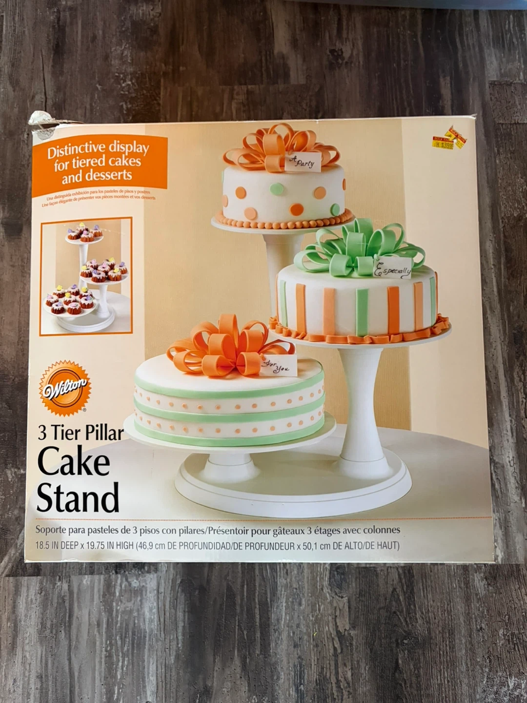This Wilton 3 Tier Pillar Cake Stand is perfect for displaying tiered cakes and desserts. It's 18.5 inches deep and 19.75 inches high. This stand is great for parties and special occasions!