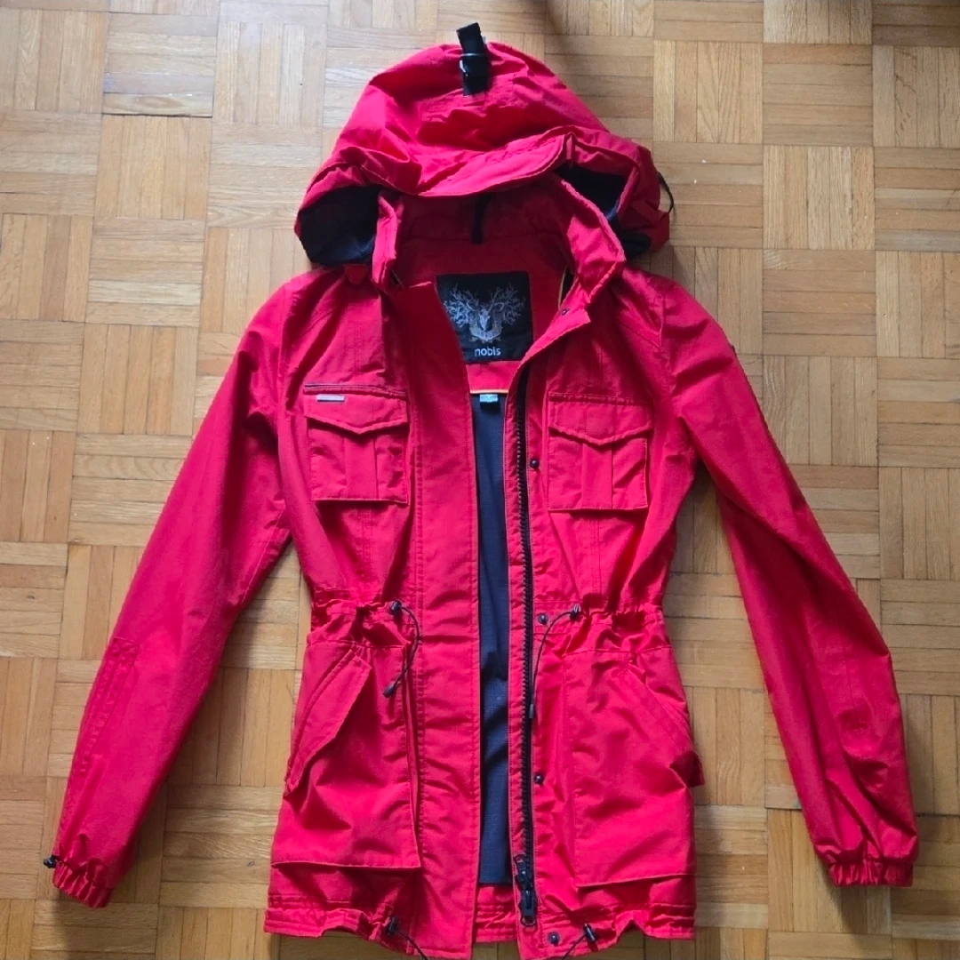 Selling a Nobis red jacket in size S/P. It features a premium cotton/nylon outer shell, machine washable design, and is designed in Canada. It also includes an interior zip stash pocket, adjustable draw cord at the waist and hem, and a removable hood. The jacket has heavy-duty magnetic closures to keep your placket secure and fully insulated