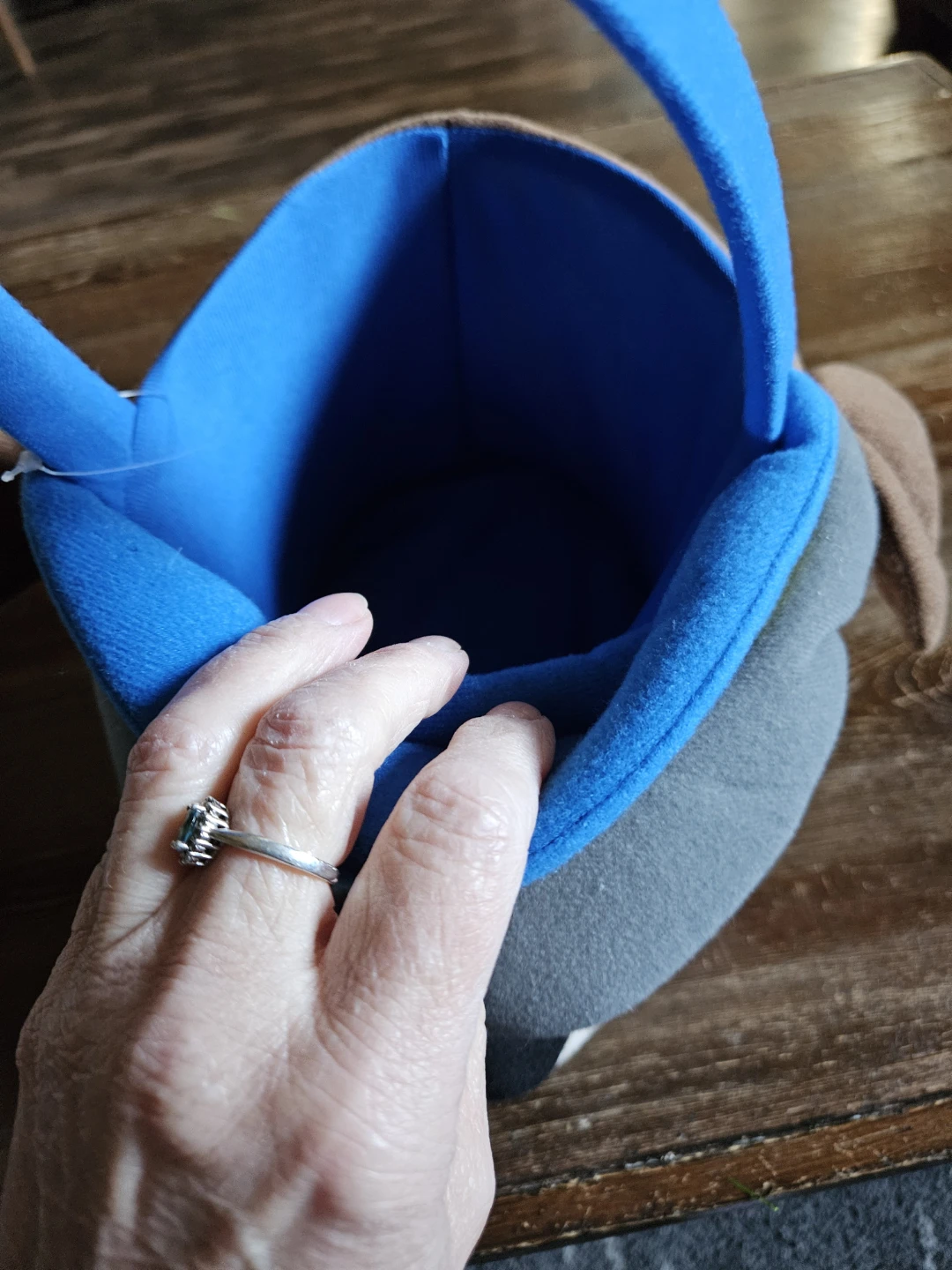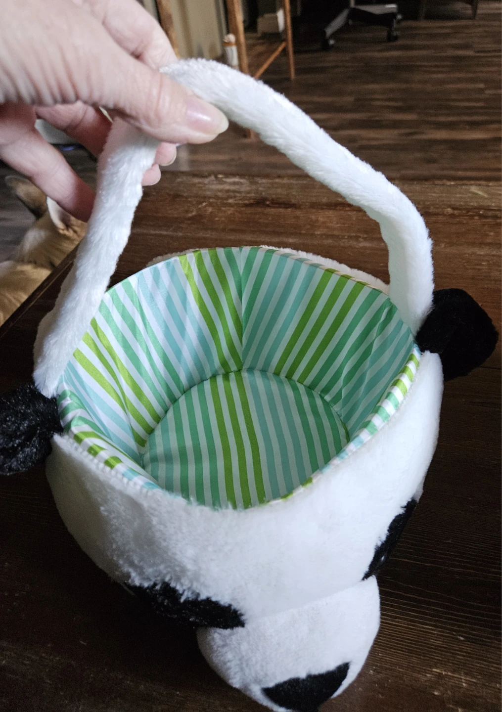 A cute panda plush basket! It's white and black with a handle. The inside has green and blue stripes. Chase basket. Great for Easter and collecting eggs. Could also be used for Halloween.