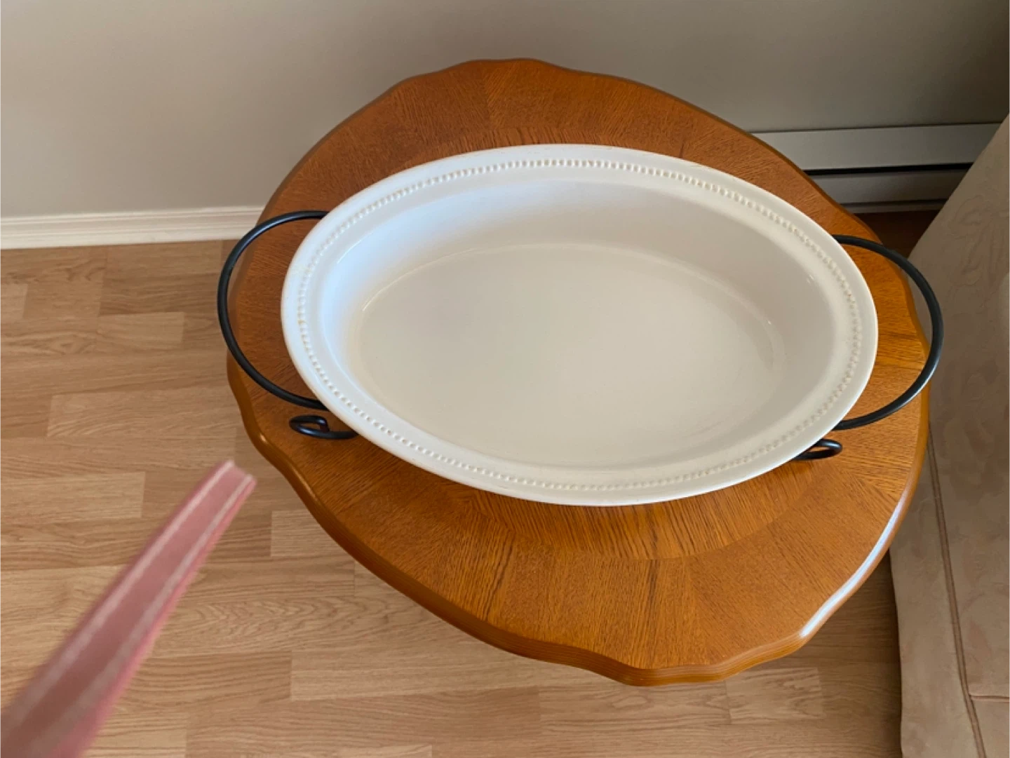 White oval ceramic baking dish with a decorative beaded edge. It comes with a black metal stand with handles. Dish is oven safe. Perfect for serving casseroles or roasts! Microwave, oven and dishwasher proof