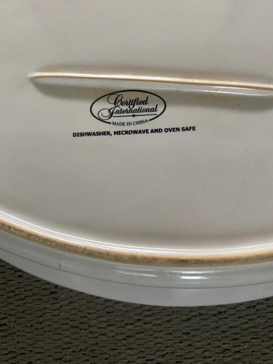 White oval ceramic baking dish with a decorative beaded edge. It comes with a black metal stand with handles. Dish is oven safe. Perfect for serving casseroles or roasts! Microwave, oven and dishwasher proof
