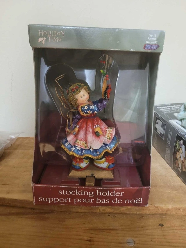 For sale we have this new Floral Flowers Garden Angel Christmas stocking Holder Hanger. In New condition. Ready for that special stocking. Nice and heavy to stay on the shelf. Measures approx. 8" tall x 4 1/2" wide. The base measures 3 1/2" x 2 1/4". The hanger part moves in and out. Asking $15 pick up on beaverbrook lane Kanata thank you