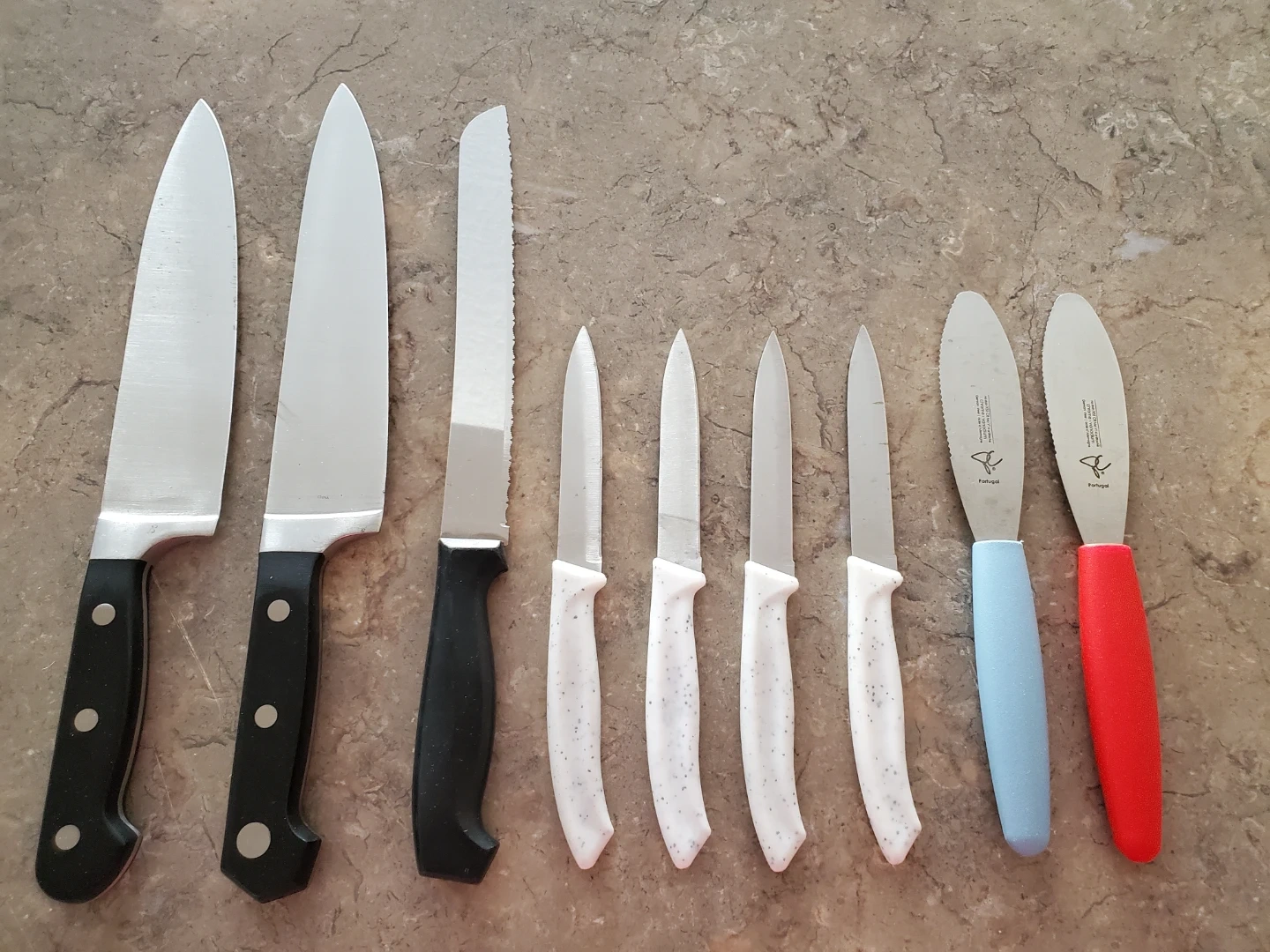 Versatile 9-piece kitchen knives. Includes two large chef knives, one serrated bread knife, four steak knives, and two spreaders. Some of them could use a sharpening, otherwise good condition. Great for everyday cooking needs.