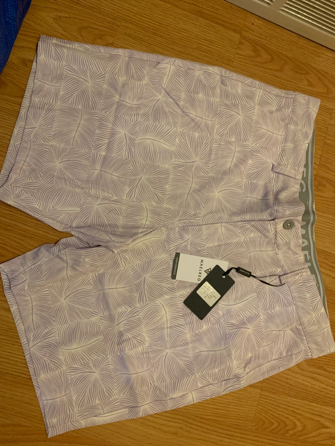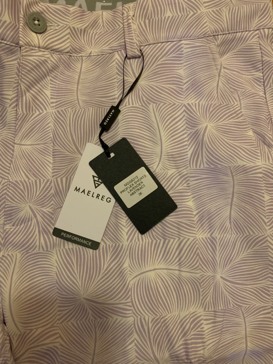 These Maelreg men's performance shorts come in a lavender abstract print. They're size 36 and designed for active wear. These shorts are suitable for golf or other outdoor activities.