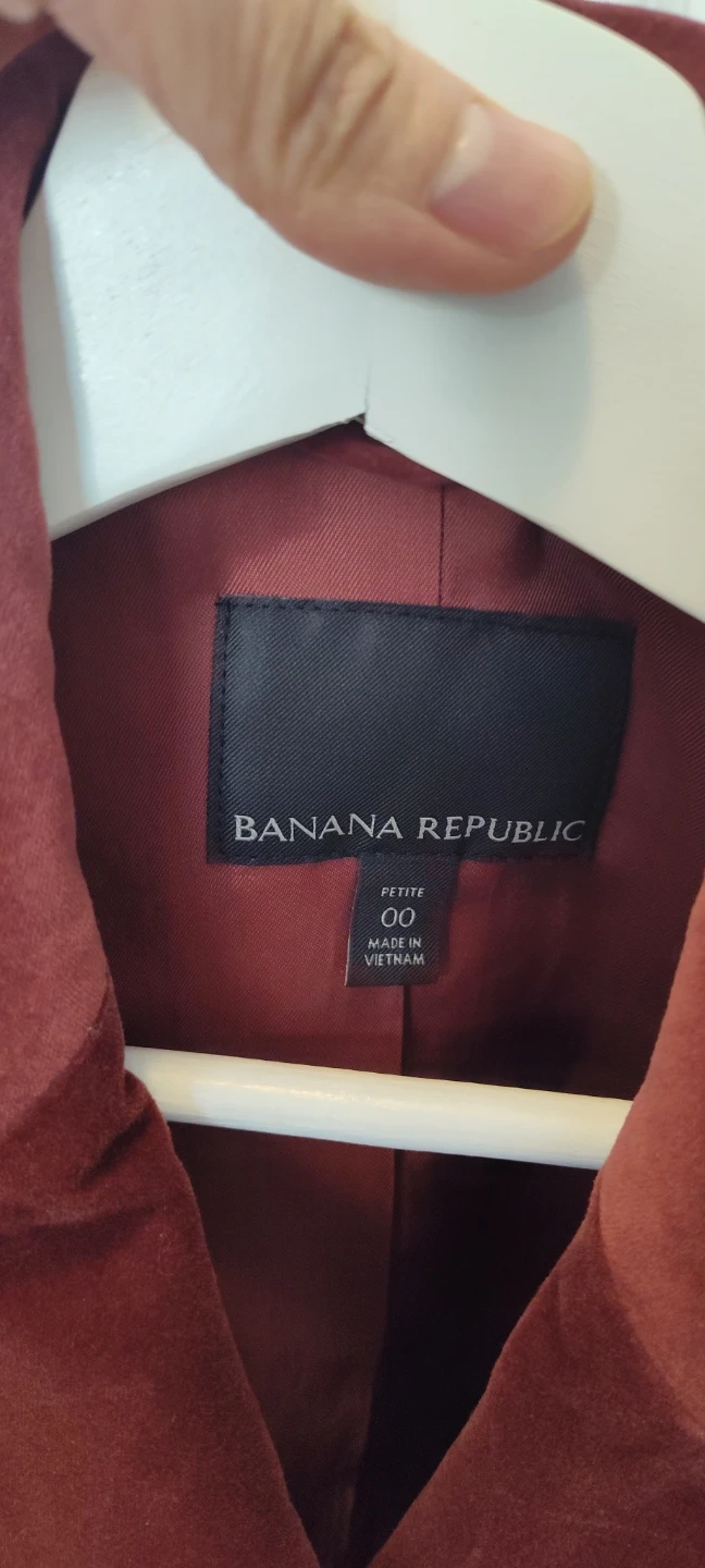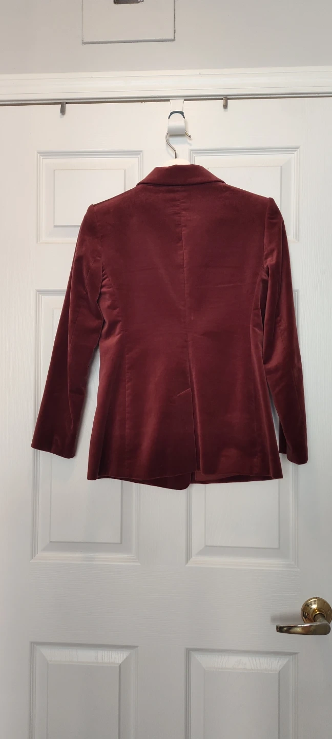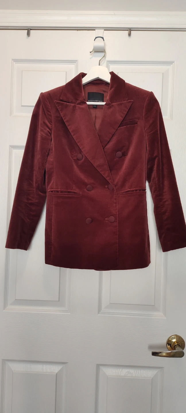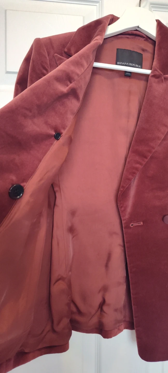 Beautiful Banana Republic blazer made of soft velvet. It's a double-breasted style with a rich reddish-brown colour. This jacket is a petite size 00. It's perfect for dressing up a casual outfit or adding a touch of sophistication to evening wear!