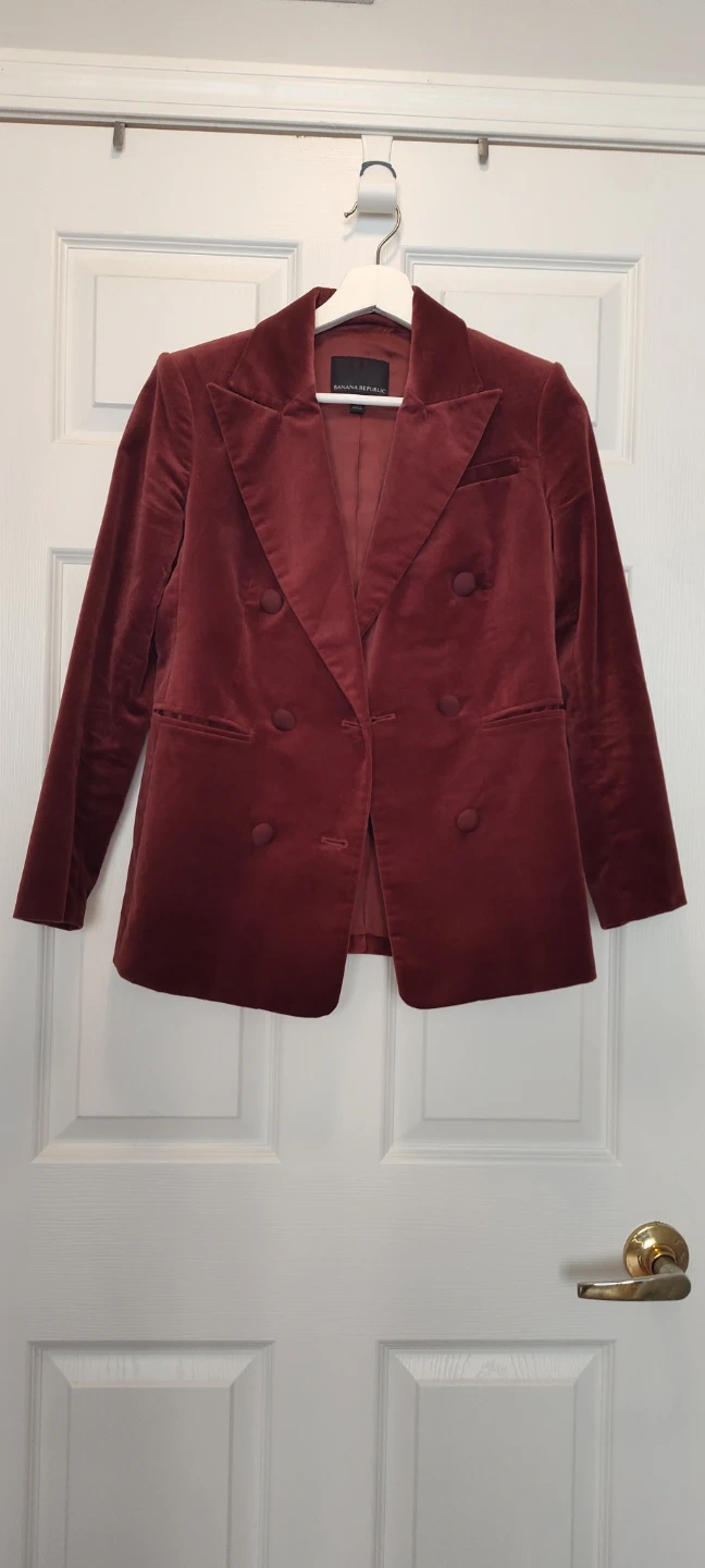 Beautiful Banana Republic blazer made of soft velvet. It's a double-breasted style with a rich reddish-brown colour. This jacket is a petite size 00. It's perfect for dressing up a casual outfit or adding a touch of sophistication to evening wear!