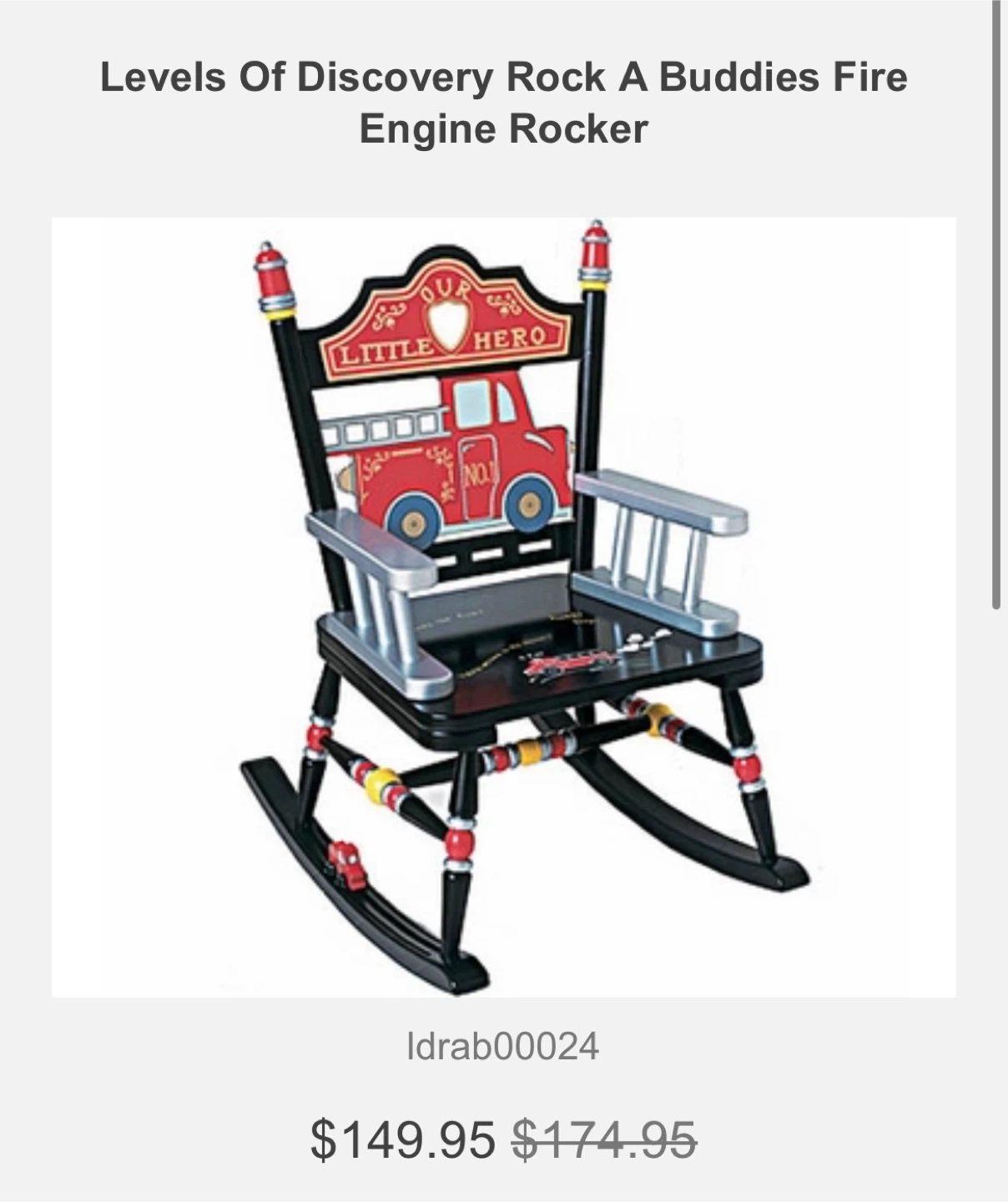 This is a fun Levels of Discovery fire engine rocking chair. It features a "Our Little Hero" theme with colourful graphics and even some text like "Where's the fire?" and "honk! beep!". It's designed for kids to enjoy imaginative play! Your child can even hear the Levels of Discovery Rock A Buddies Fire Engine Rocker's siren chug along when the chair rocks. Levels of Discovery has specially designed this fire-engine themed chair just for your little hero. Just flip a switch to turn the engine off. Somewhere on the bottom from rocking but otherwise in great condition I also have a brand new rocker leg to replace one that was said to have a crack but we never used it