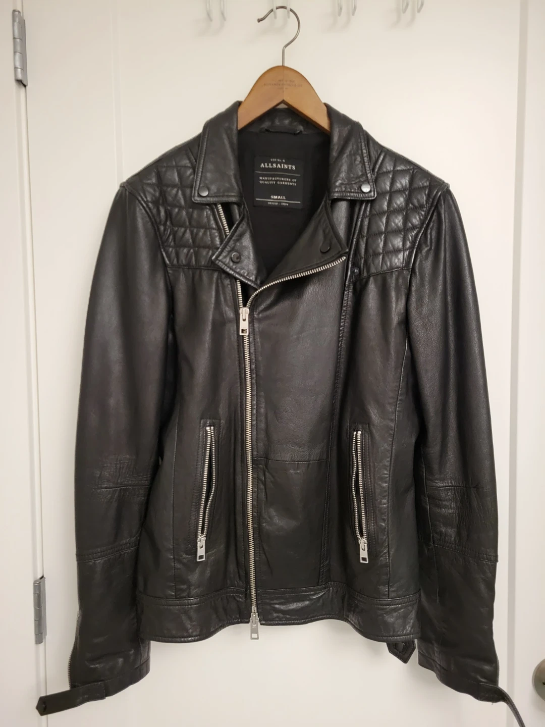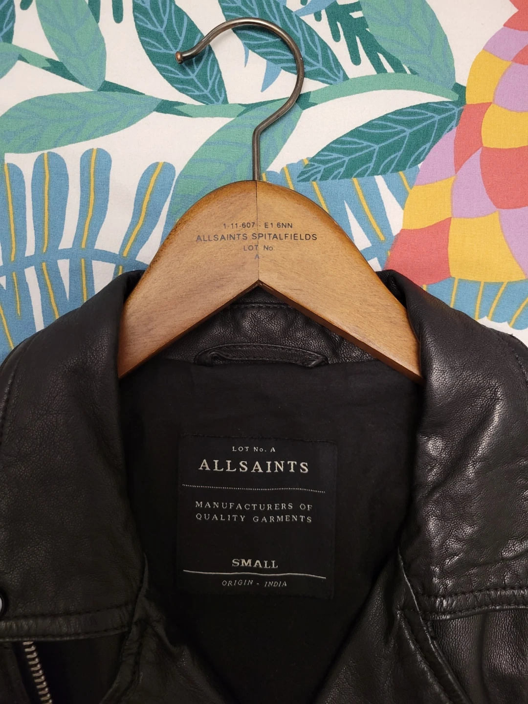 Here's a stylish AllSaints leather biker jacket in size Small. It's in great shape and ready for a new owner! The jacket is made from quality materials and has a classic design that will never go out of style.
