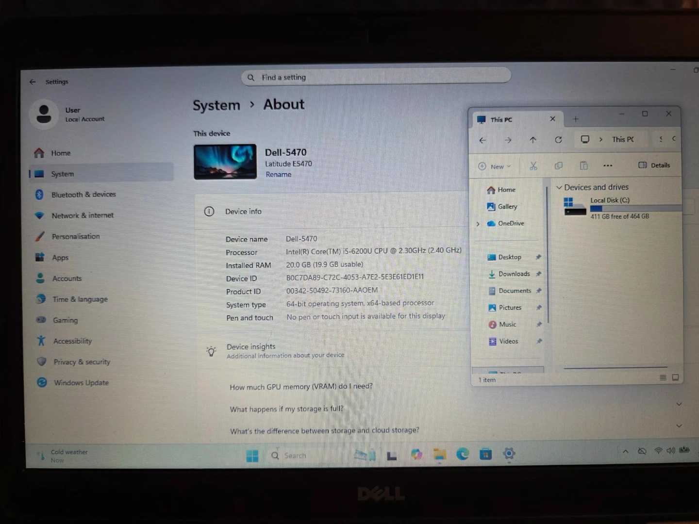 Selling a Dell Latitude E5470 laptop. WINDOWS 11 Pro . It has an Intel(R) Core(TM) i5-6200U CPU @ 2.30GHz (2.40 GHz) processor and 20.0 GB (19.9 GB usable) of installed RAM. It comes with a 64-bit operating system and an x64-based processor. The device ID is B0C7DA89-C72C-4D53-A7E2-5E3E61ED1E11 and the product ID is 00342-50482-73160-AAOEM. It has 411 GB free of 464 GB.