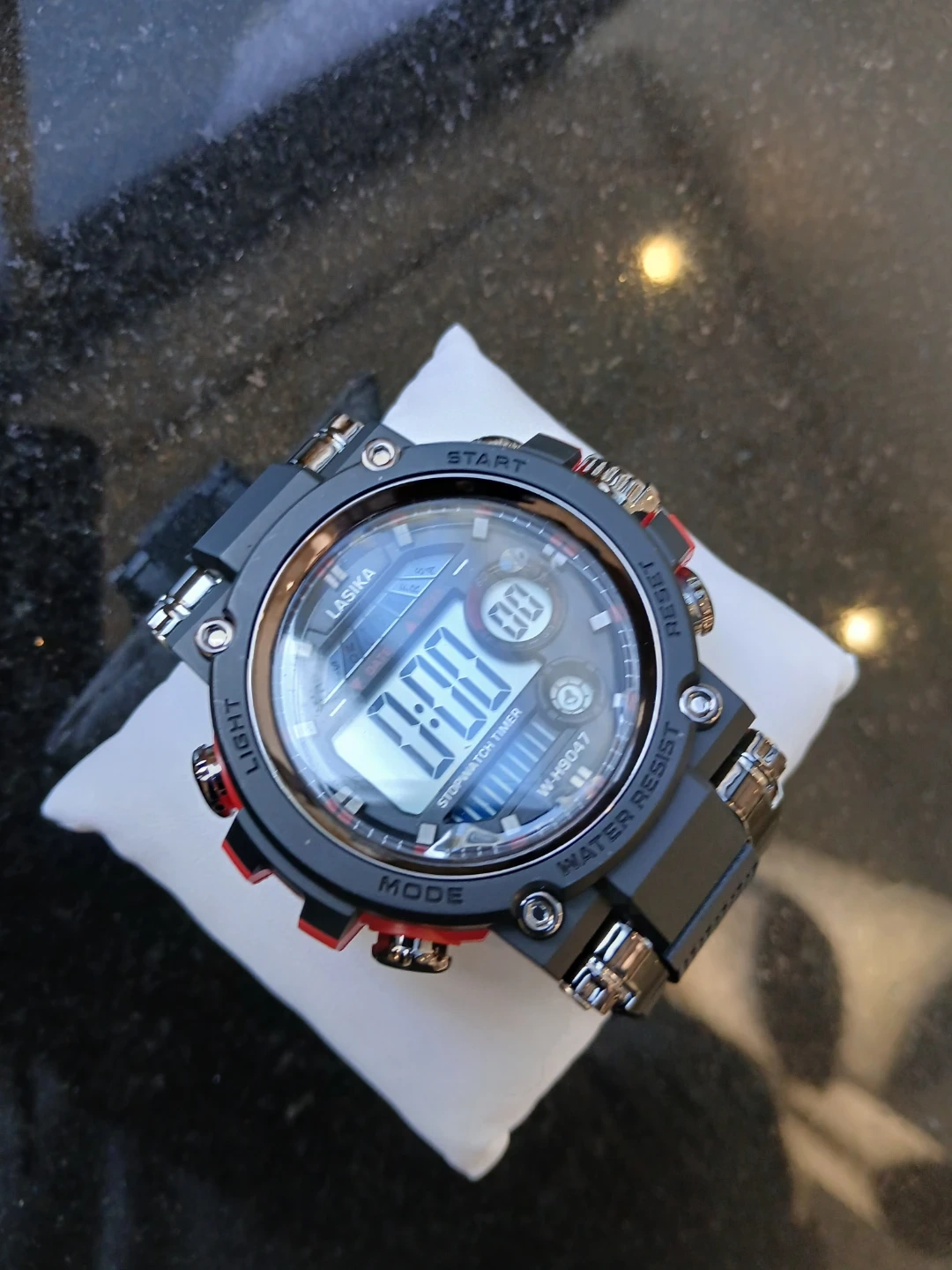 LASIKA digital watch with stopwatch timer function. Features water resistance. Black band with red accents. $25