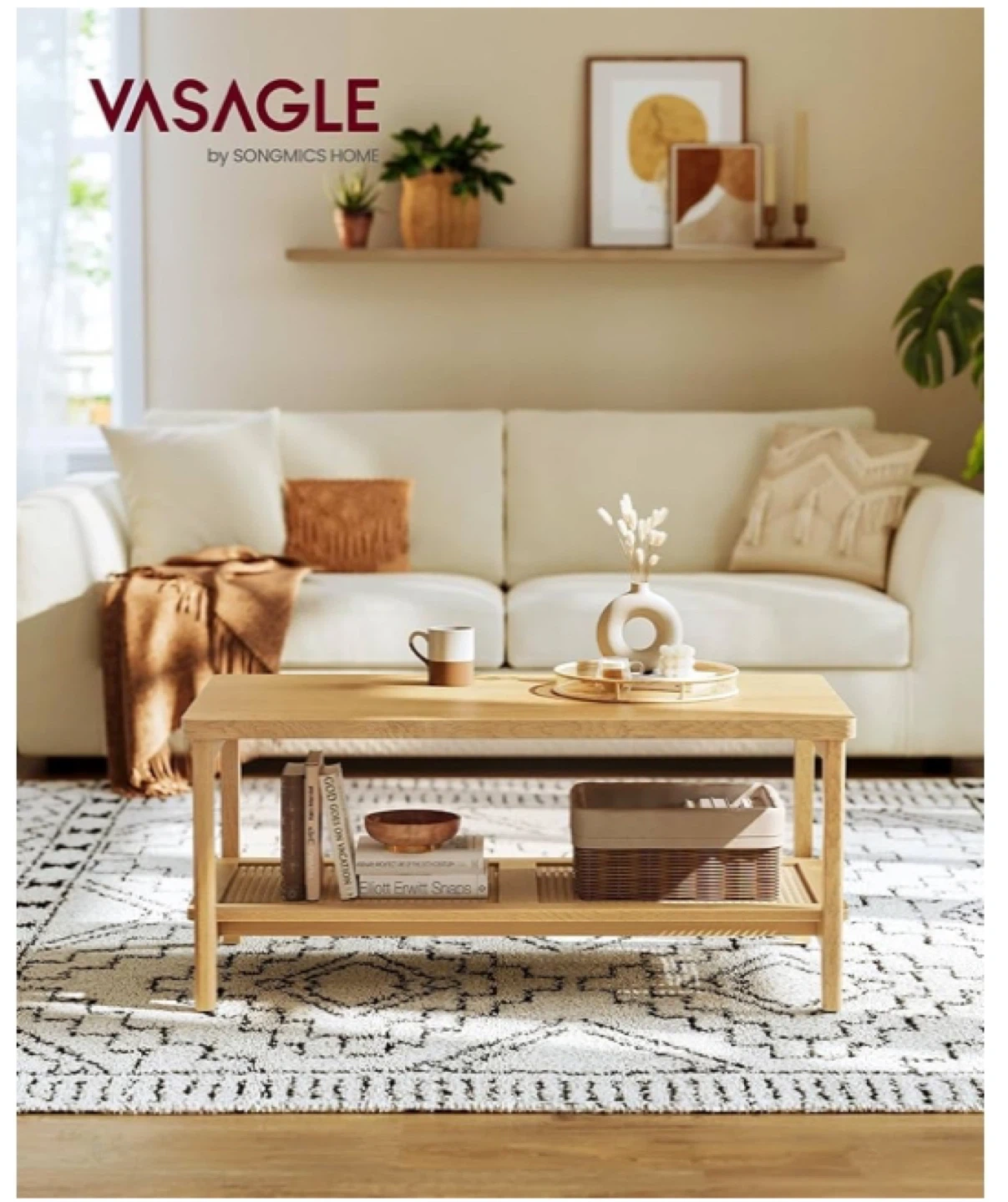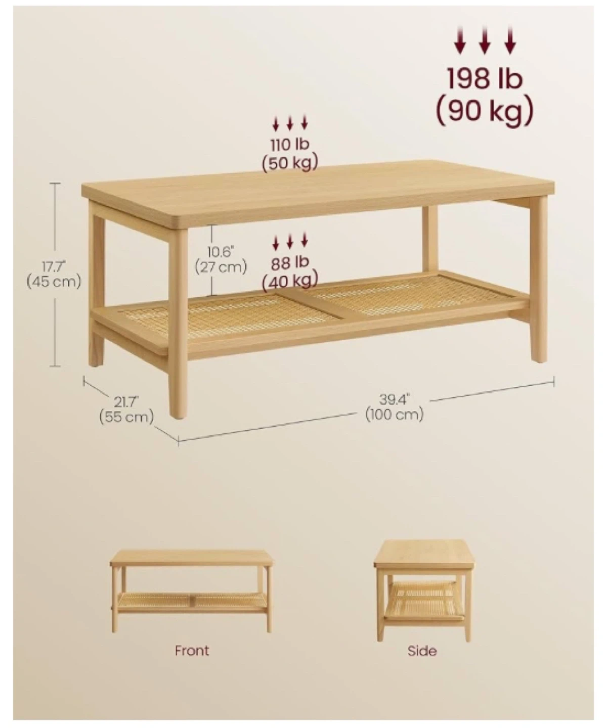 This VASAGLE coffee table features a natural wood finish and a two-tier design with woven cane shelves. Its dimensions are 39.4" L x 21.7" W x 17.7" H. The top shelf supports up to 198 lb (90 kg), and the lower shelf supports up to 110 lb (50 kg).