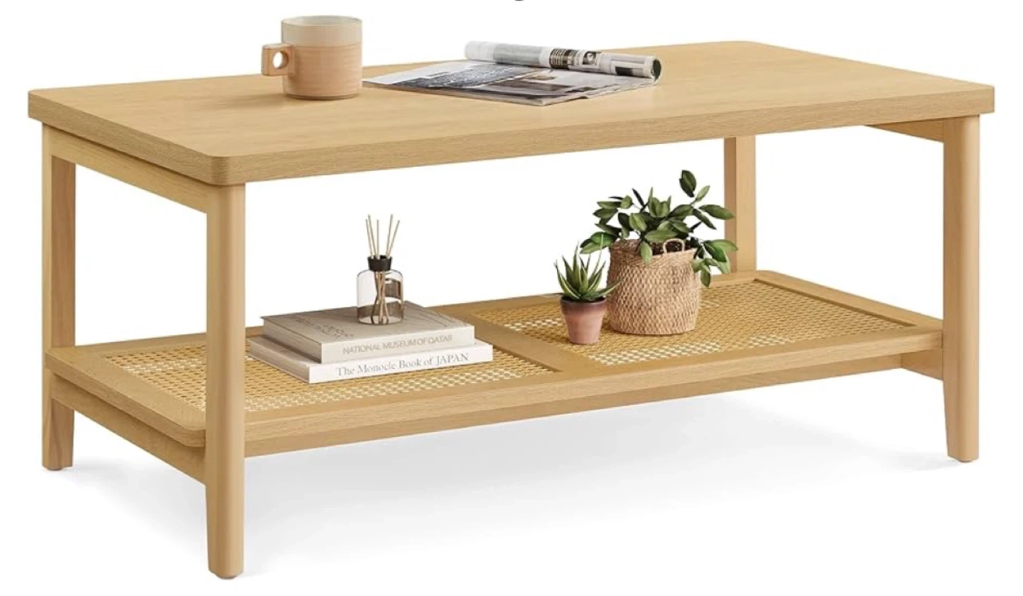 This VASAGLE coffee table features a natural wood finish and a two-tier design with woven cane shelves. Its dimensions are 39.4" L x 21.7" W x 17.7" H. The top shelf supports up to 198 lb (90 kg), and the lower shelf supports up to 110 lb (50 kg).