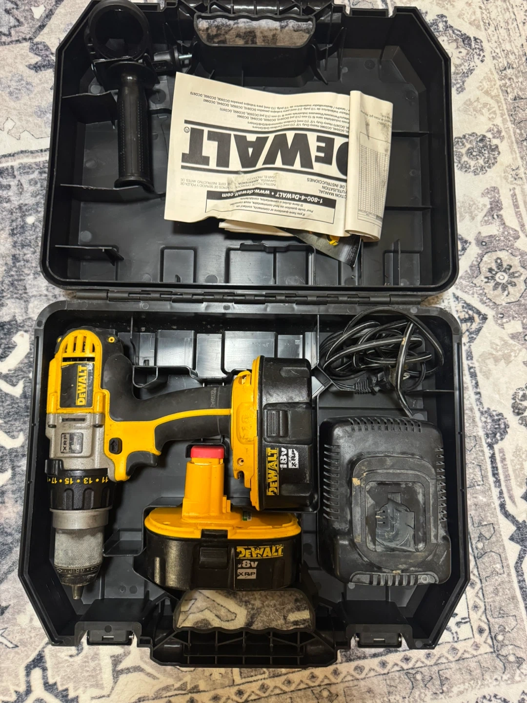 Selling a DeWalt DCD950 18V cordless drill/driver kit. It comes with the drill, two batteries, charger, side handle, and the original case. It's in used condition but still works great!