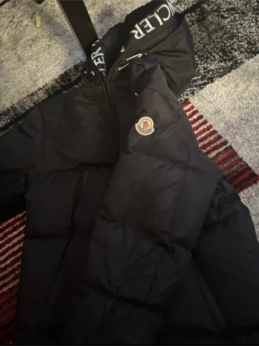 Black Moncler puffer jacket with the iconic logo patch. It's made with premium materials for warmth and style. Includes a Moncler shopping bag.
