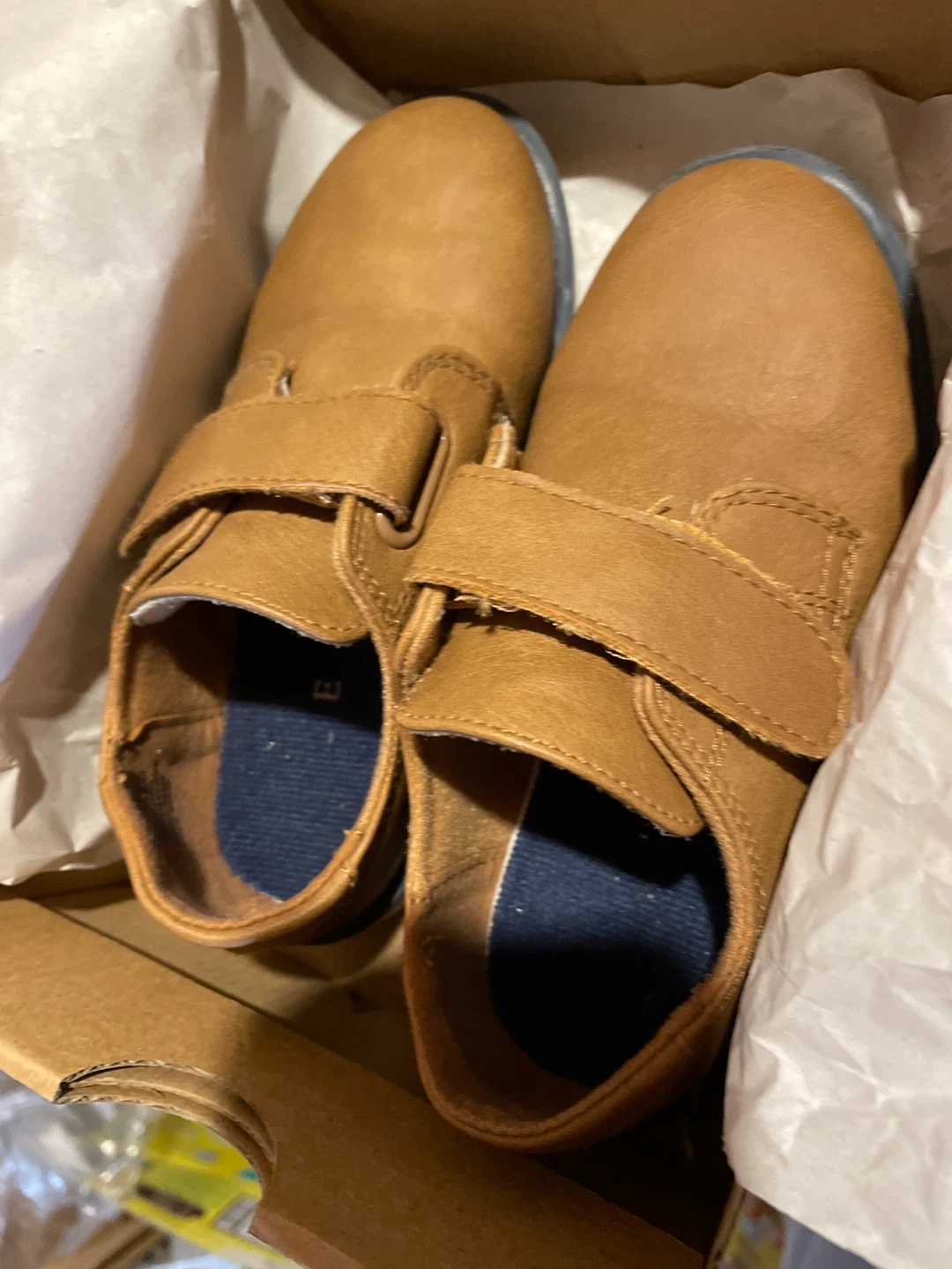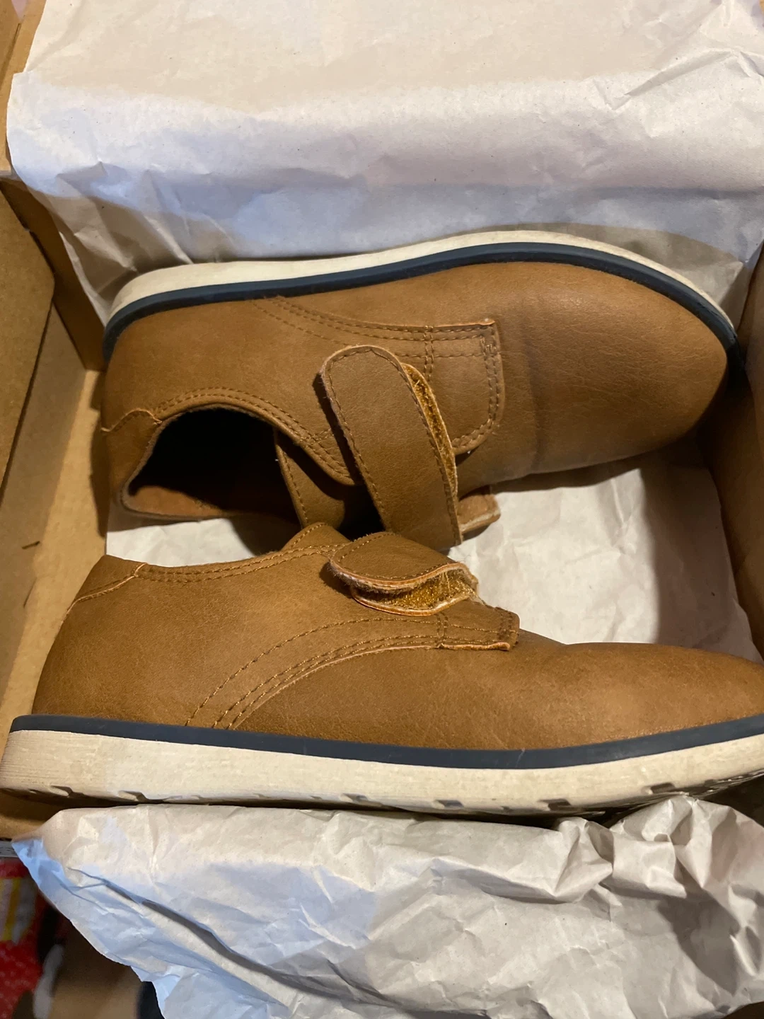 These are brown faux leather shoes with Velcro straps for easy on and off. They have a comfortable blue and white sole. Perfect for your little one's everyday wear!