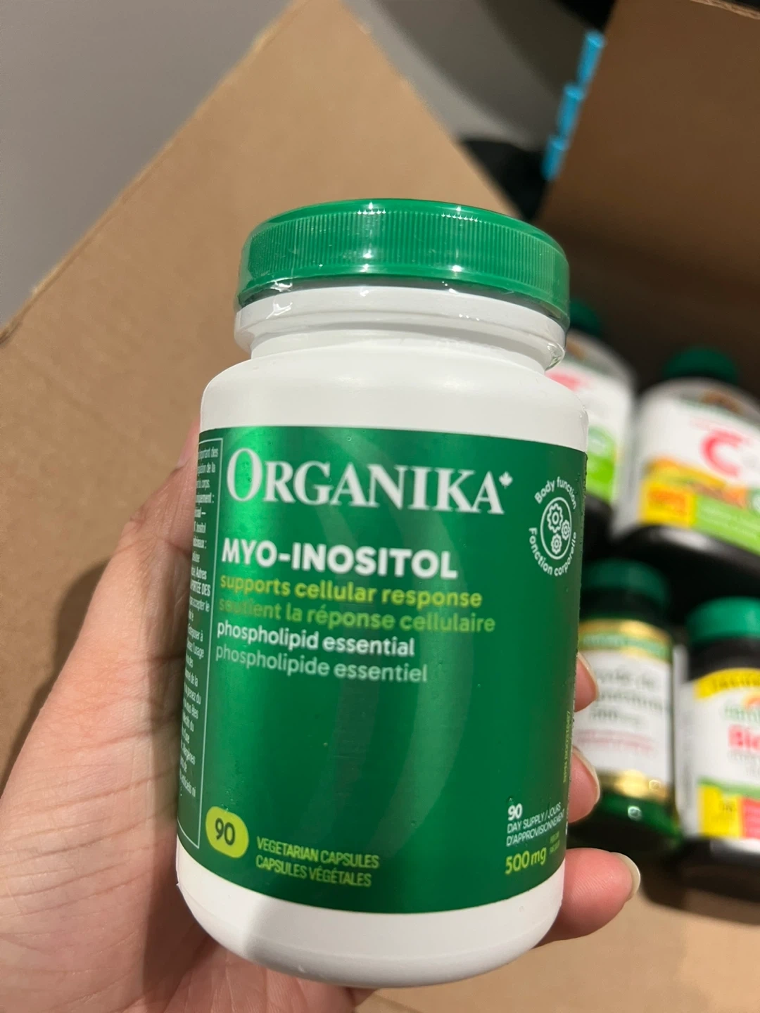 Includes Jamieson Chewable Vitamin C (500mg, 100+20 tablets), Organika Myo-Inositol (500mg, 90 vegetarian capsules), Nature's Bounty Magnesium Oxide (500mg, 100 capsules), Value Size Jamieson Biotin (10,000mcg, 90 softgels), and Nature's Bounty Ferrous Bisglycinate 28mg (150 capsules). Expiry dates range from 2026 to 2028.