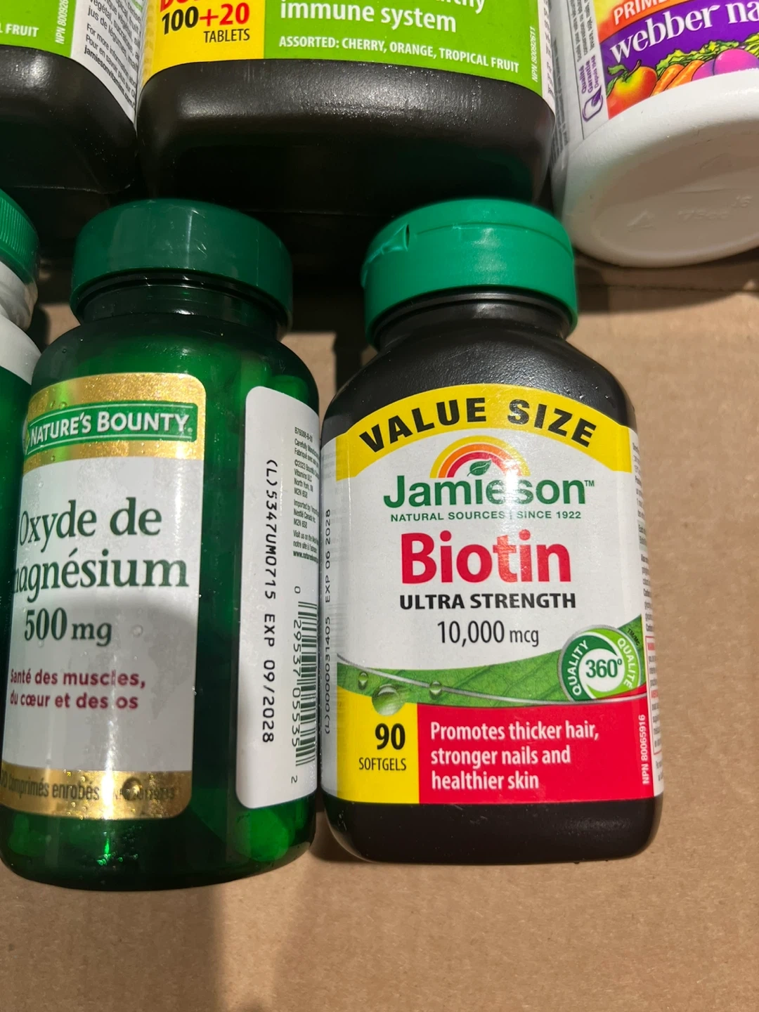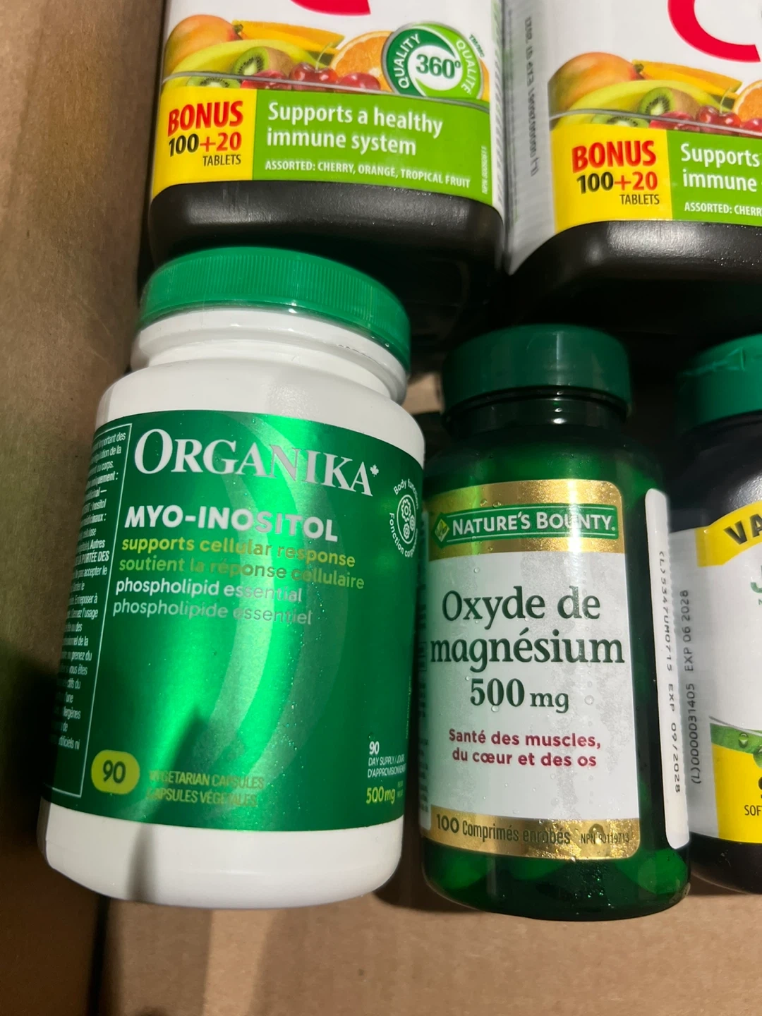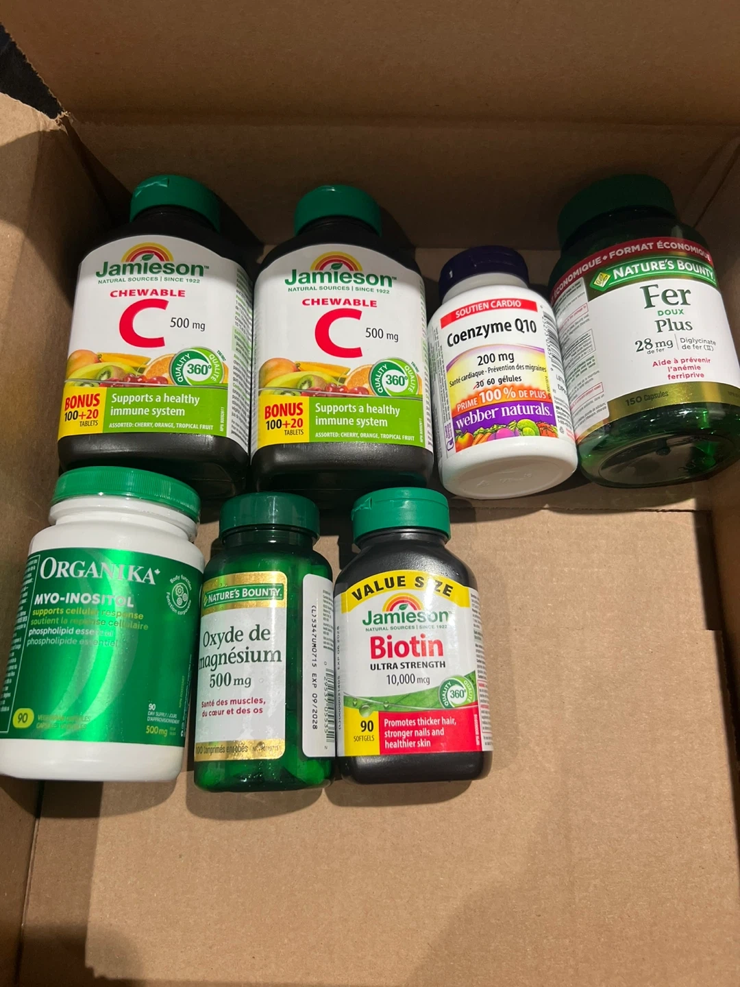 Includes Jamieson Chewable Vitamin C (500mg, 100+20 tablets), Organika Myo-Inositol (500mg, 90 vegetarian capsules), Nature's Bounty Magnesium Oxide (500mg, 100 capsules), Value Size Jamieson Biotin (10,000mcg, 90 softgels), and Nature's Bounty Ferrous Bisglycinate 28mg (150 capsules). Expiry dates range from 2026 to 2028.