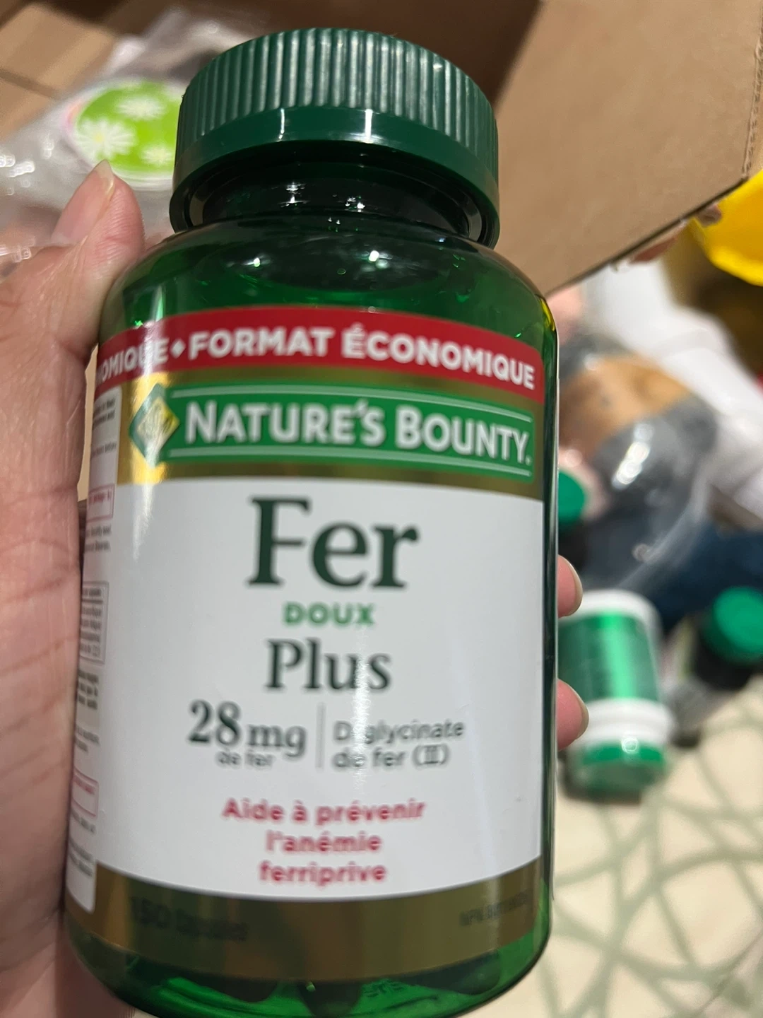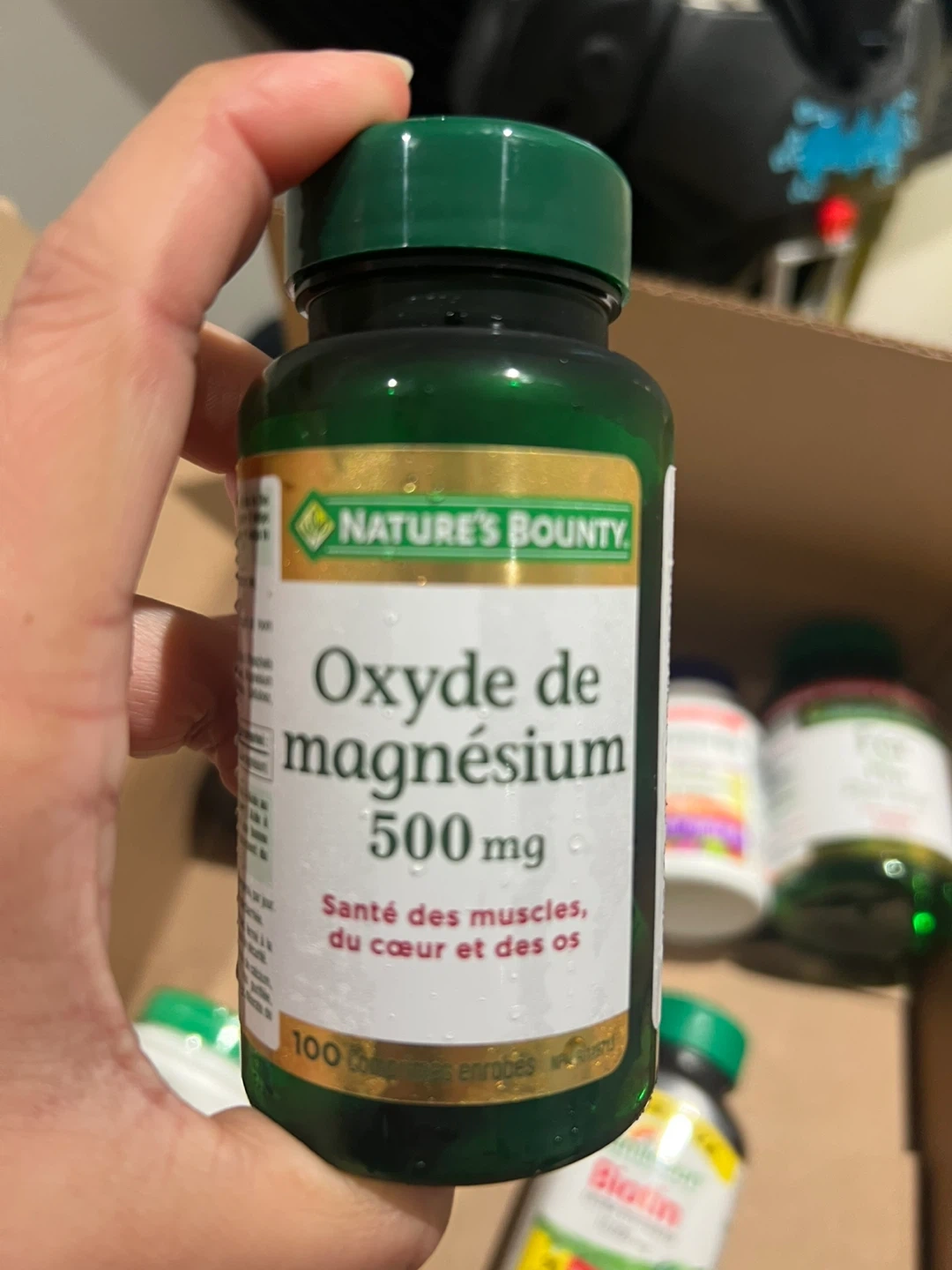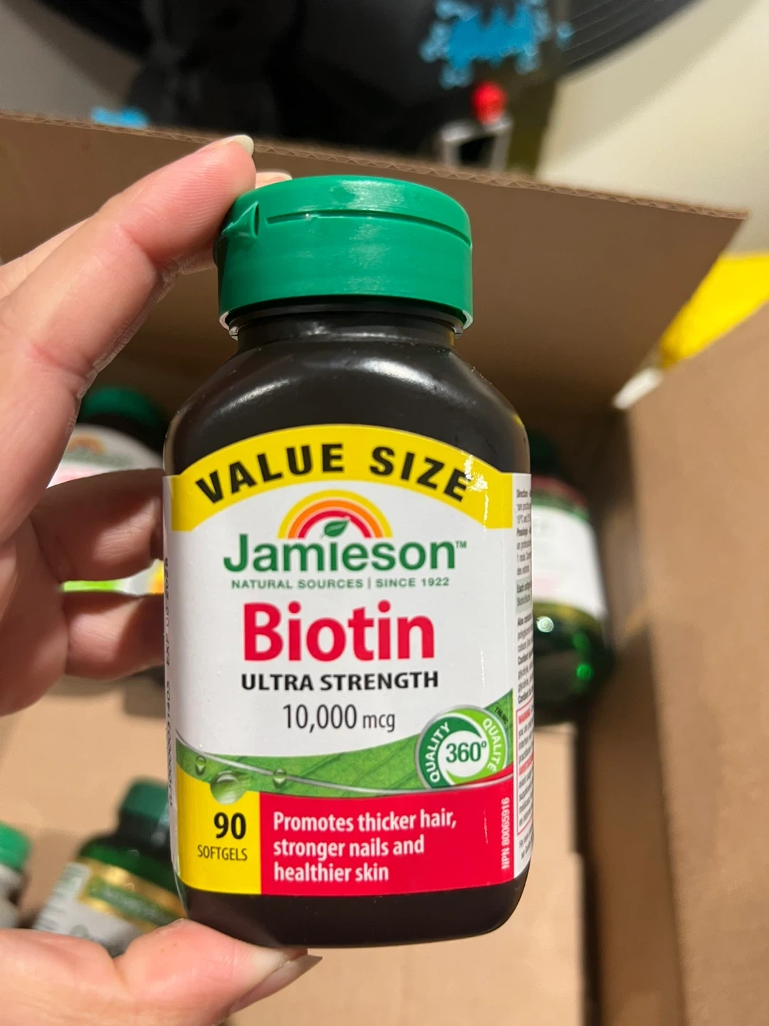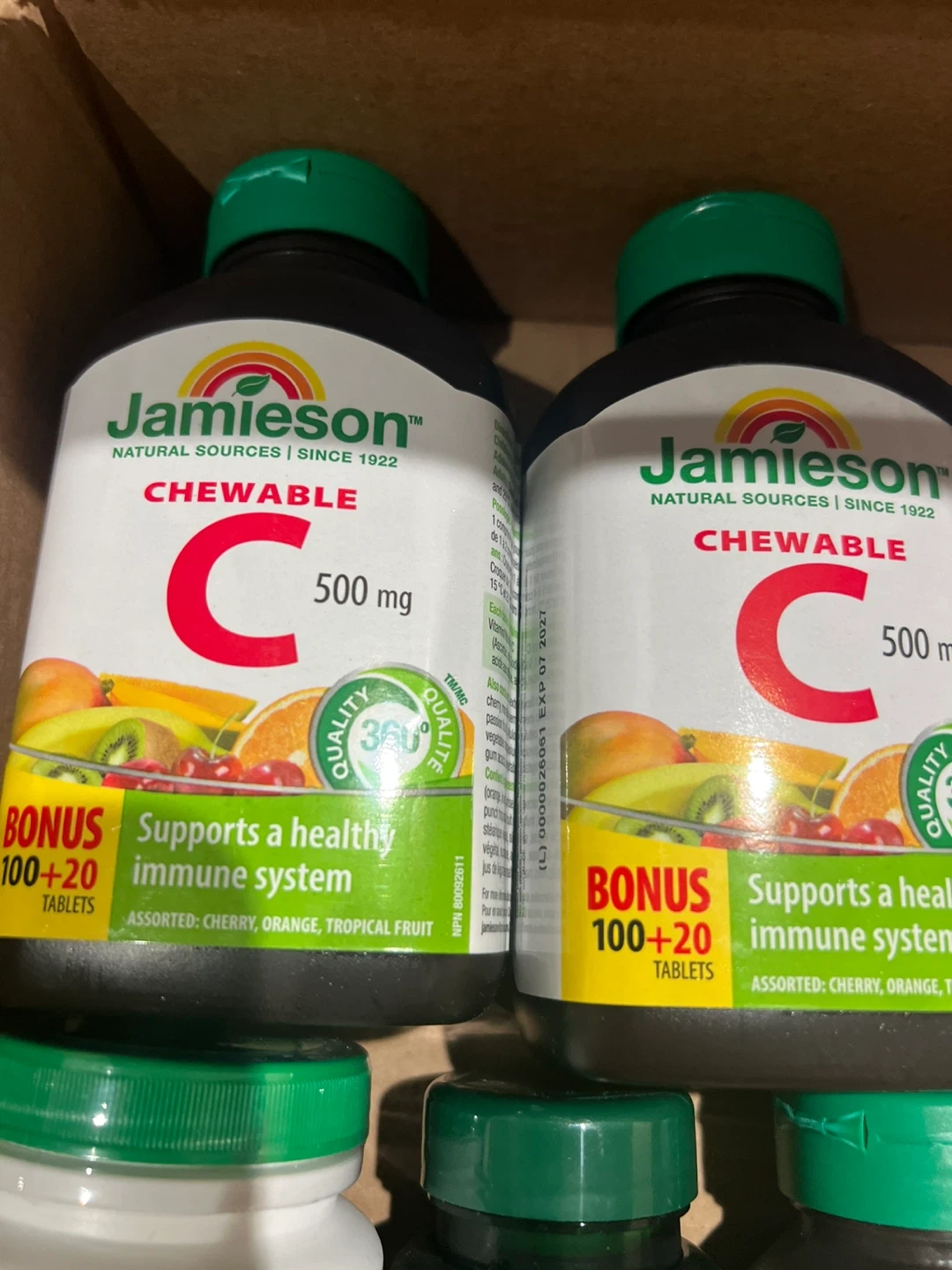 Includes Jamieson Chewable Vitamin C (500mg, 100+20 tablets), Organika Myo-Inositol (500mg, 90 vegetarian capsules), Nature's Bounty Magnesium Oxide (500mg, 100 capsules), Value Size Jamieson Biotin (10,000mcg, 90 softgels), and Nature's Bounty Ferrous Bisglycinate 28mg (150 capsules). Expiry dates range from 2026 to 2028.