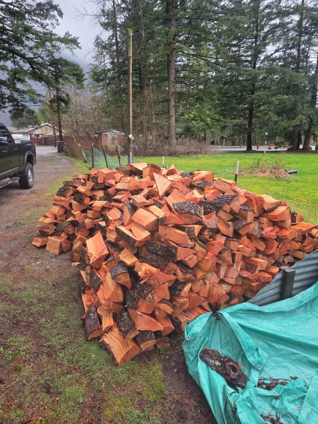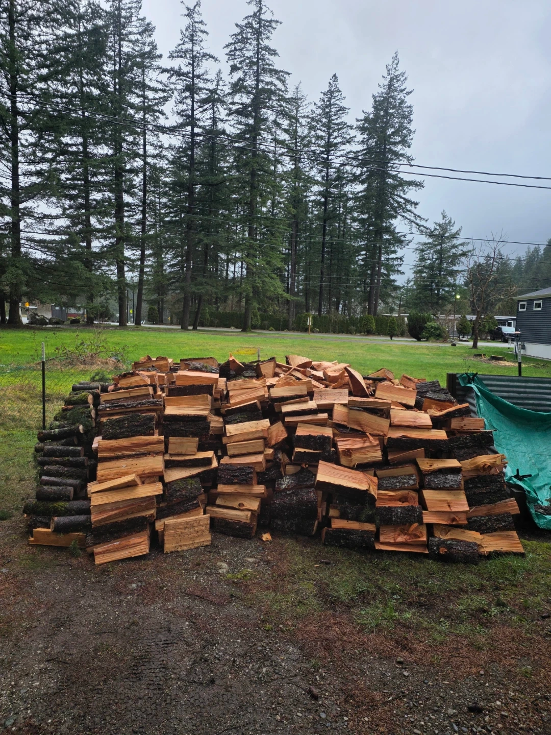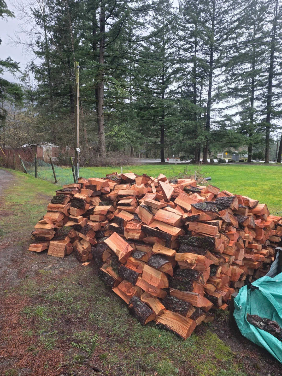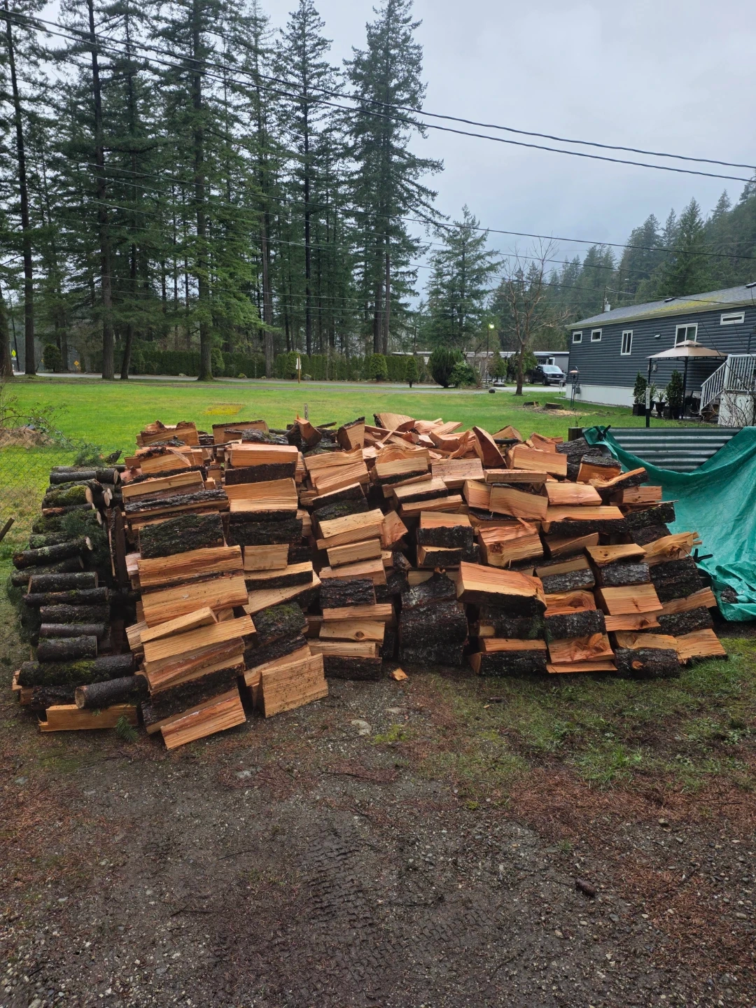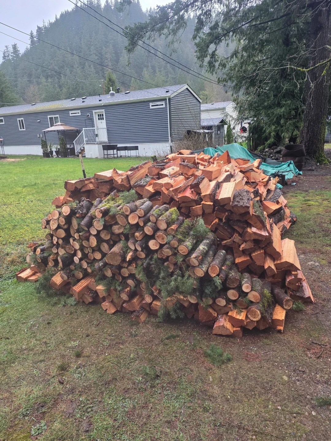 Close to 3 cords, could be more, freshly split Fir. Should be seasoned by the winter. I had the tree cut down 2 weeks ago, and just finished splitting it today.