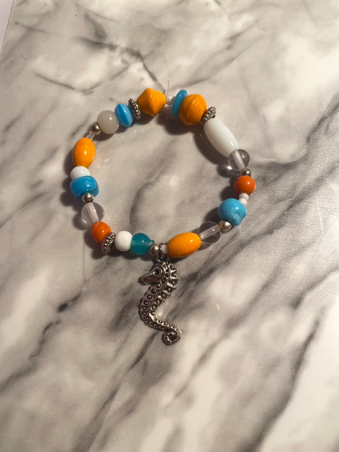 This is a cute beaded bracelet with a seahorse charm! It features a mix of colourful beads in shades of orange, blue, and white, along with clear beads. The seahorse charm adds a nice touch! It's in great condition and ready to wear