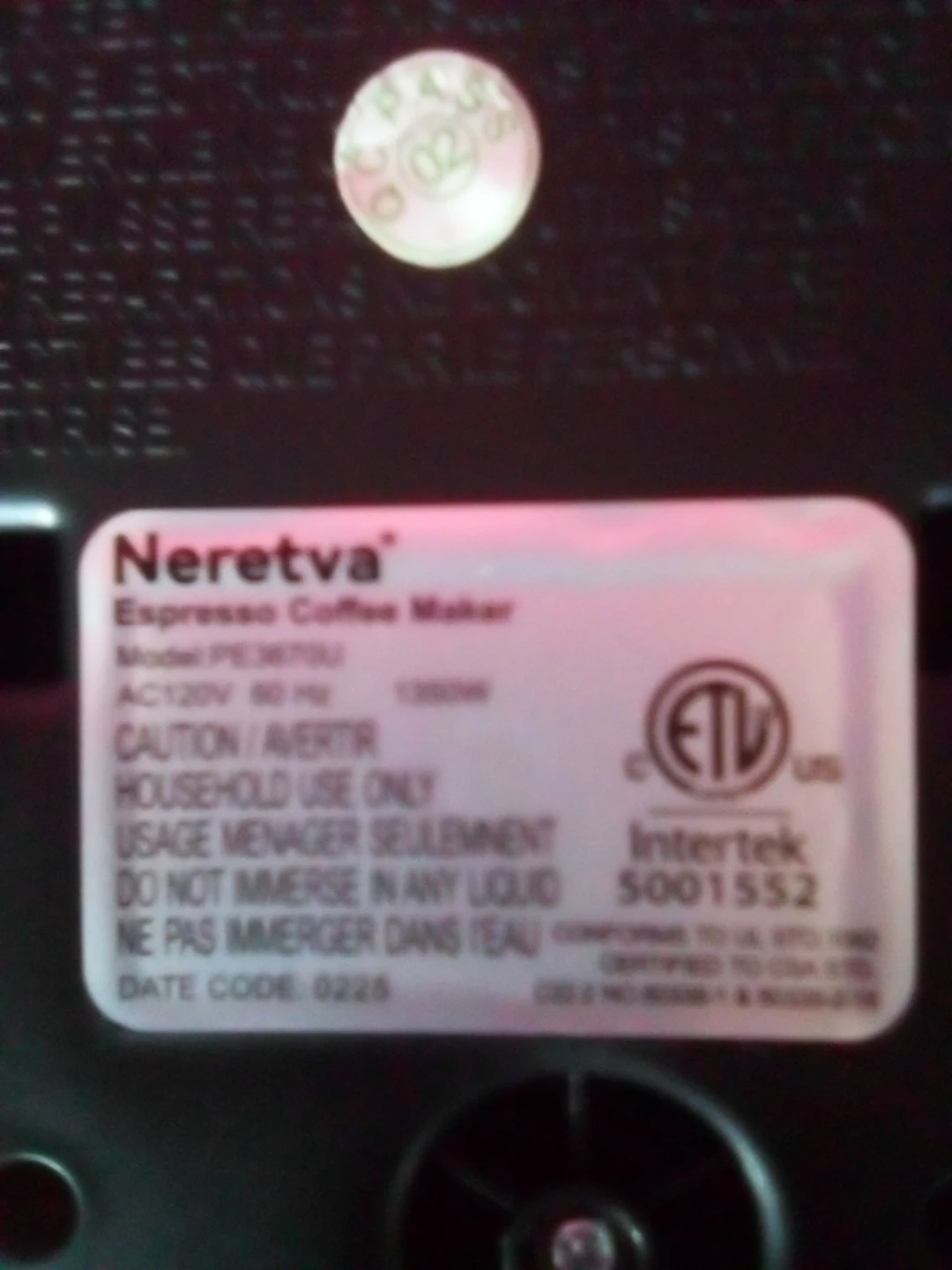 This is a Neretva espresso coffee maker. It's a model PE3070U, powered by AC120V, 60 Hz, and 1350W. For household use only. It is missing one piece only shown in the last pic, selling as is if you have the part or can get it