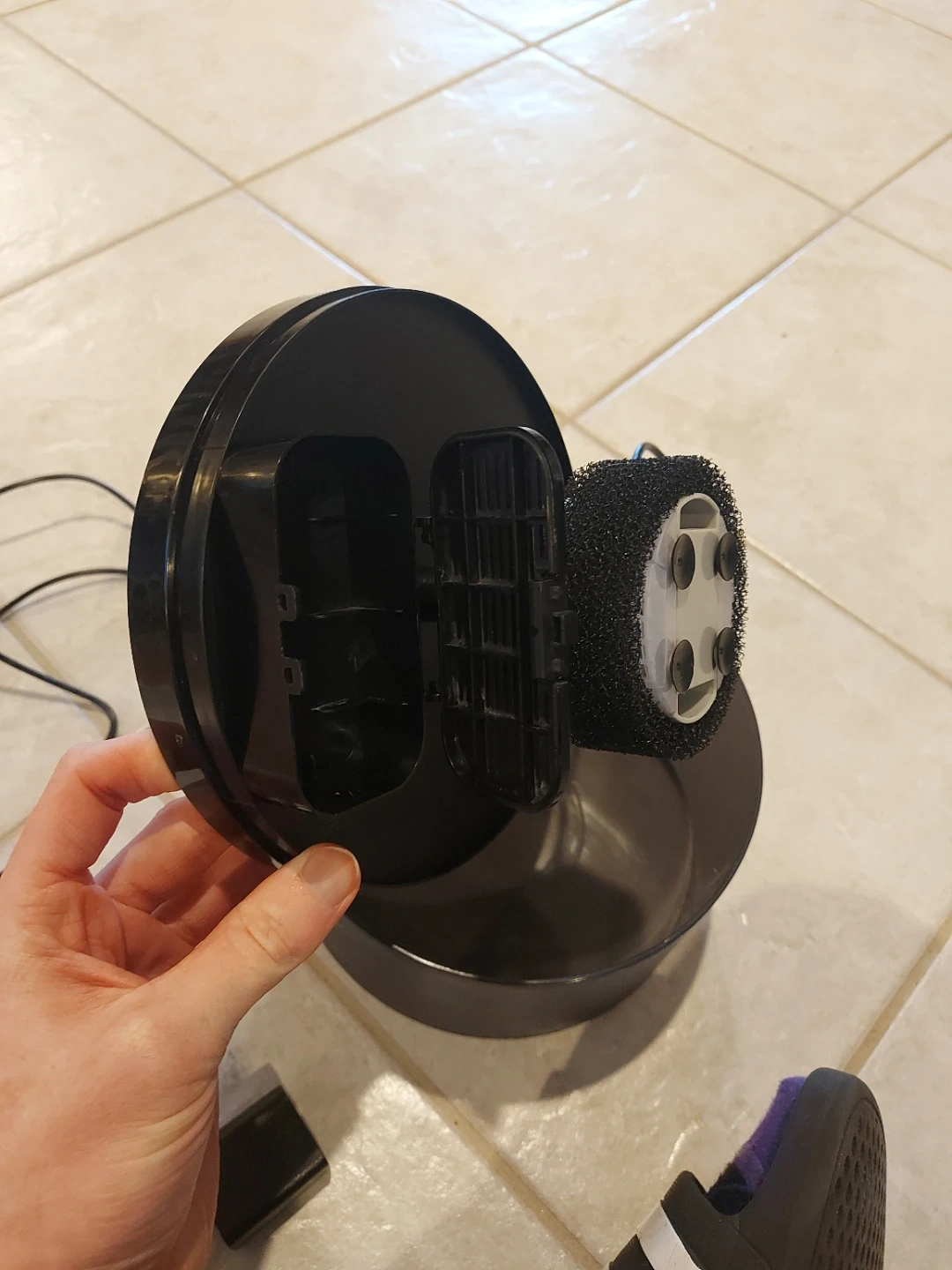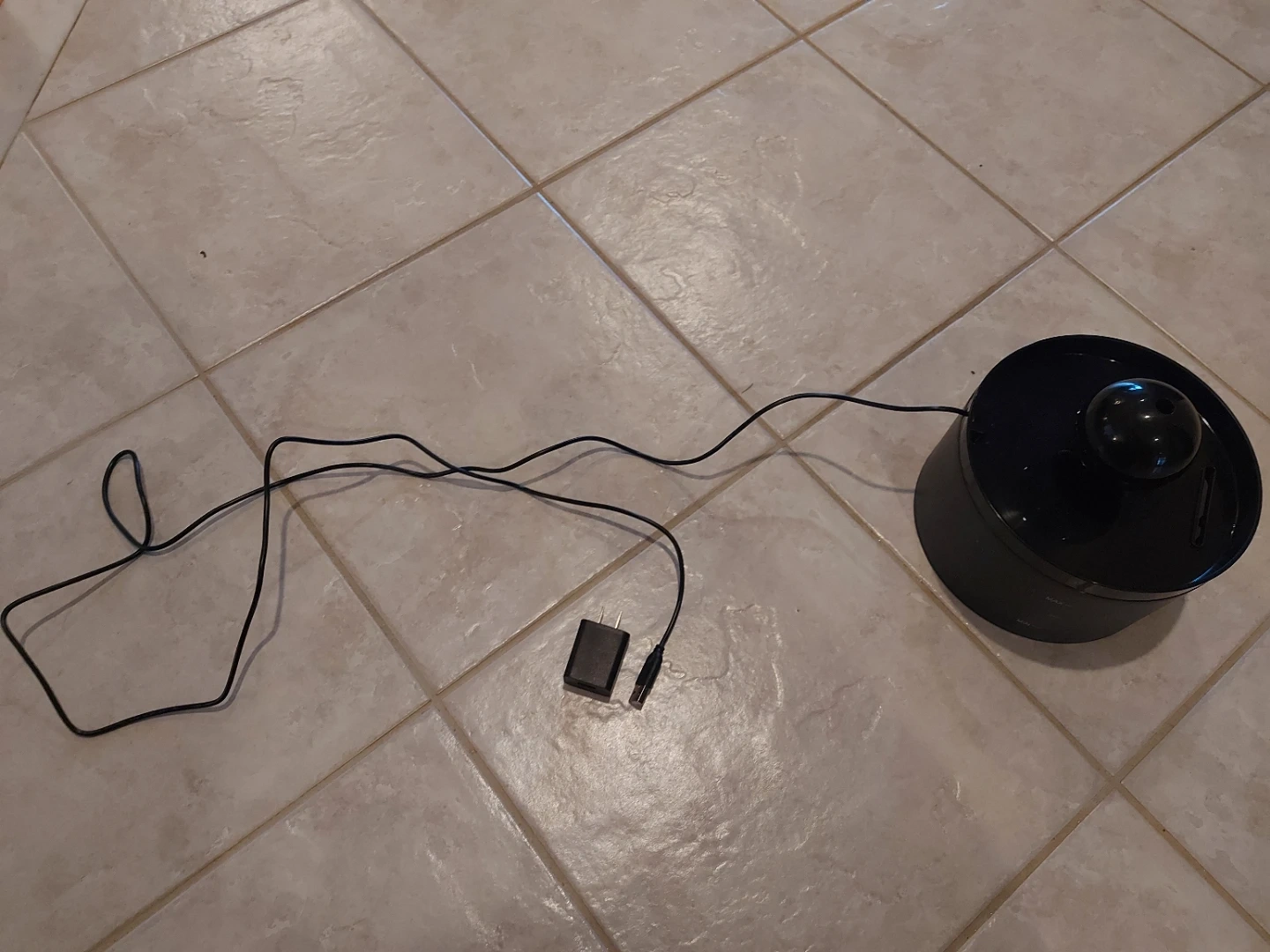 Black water fountain (generally for cats). Needs a drain filter, but is otherwise clean and ready to use. Power cord is roughly 1m long.
